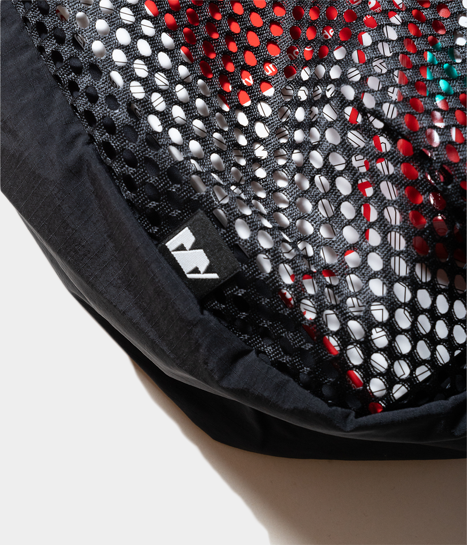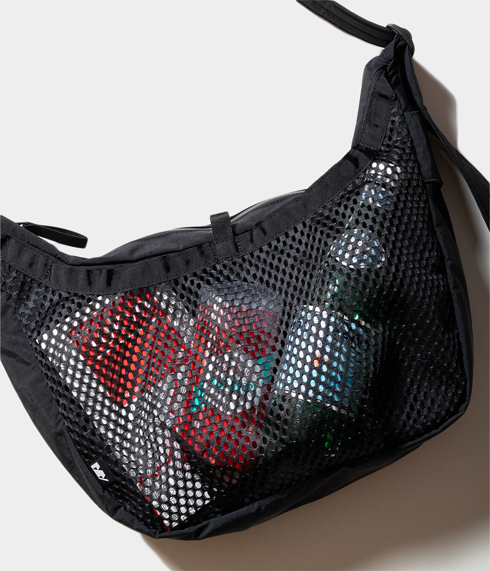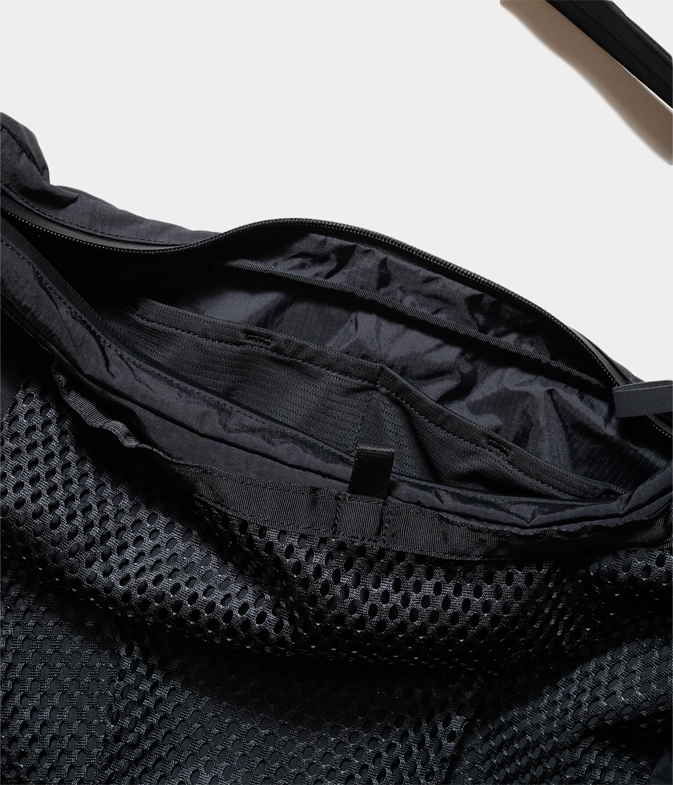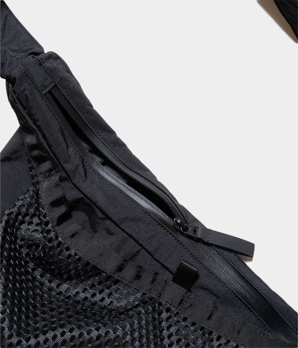 その名の通りさっと肩に掛けて身軽に出かけるためのバッグです。9Lの容量があり13インチのラップトップも入るサイズで、フロントの全面に設けられた外ポケットはメッシュ素材を採用し収納するアイテムによってバッグの表情も変化します。本体内側にはメッシュのインナーポケットを配しスマートフォンやイヤフォン、リップスティックなどの小物の収納に便利です。テープ末端のリフレクターテープもポイントになっています。