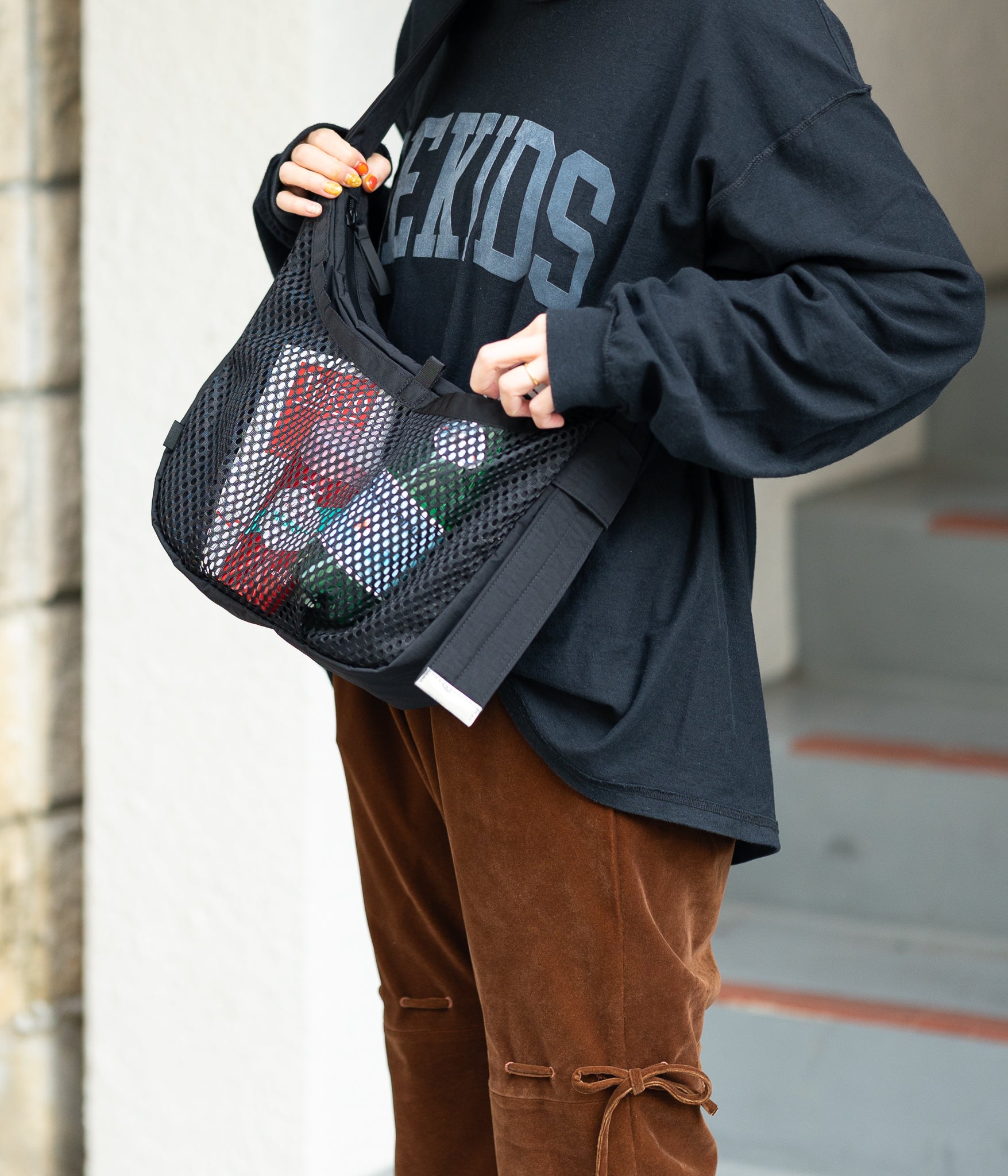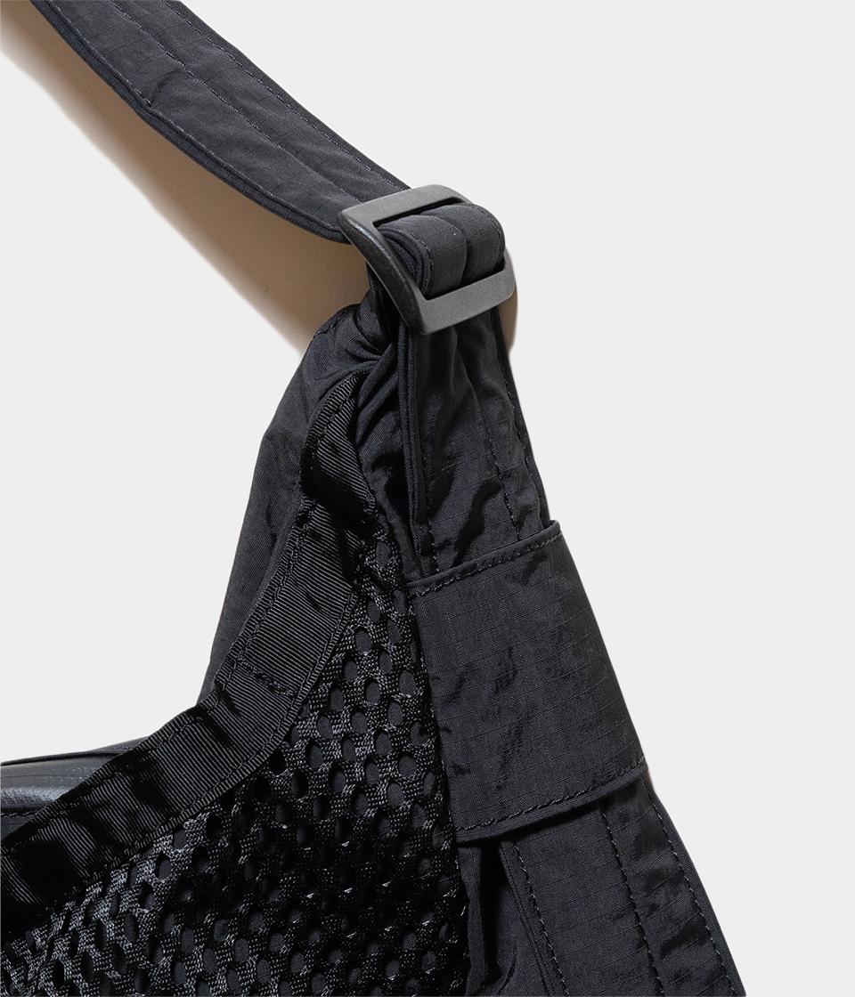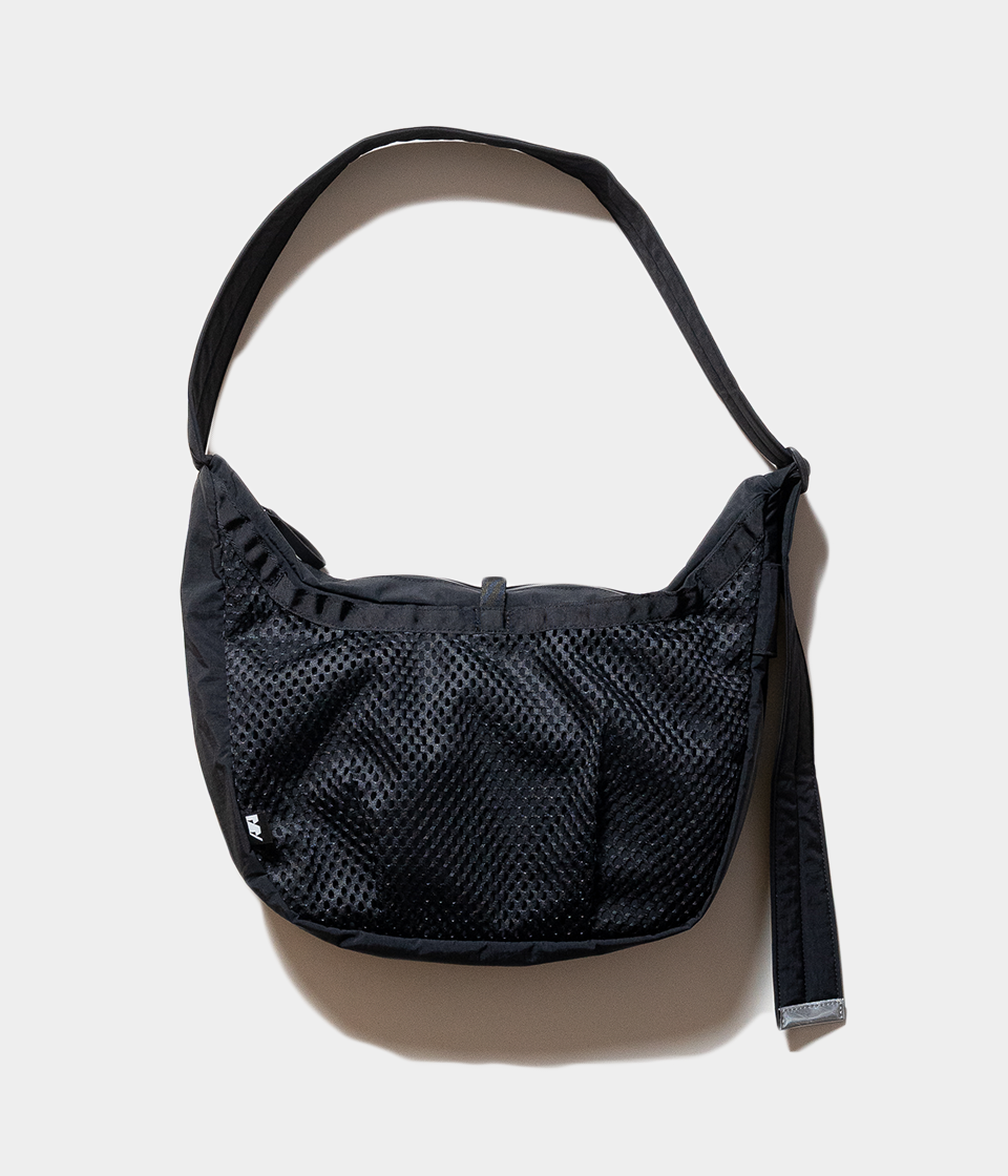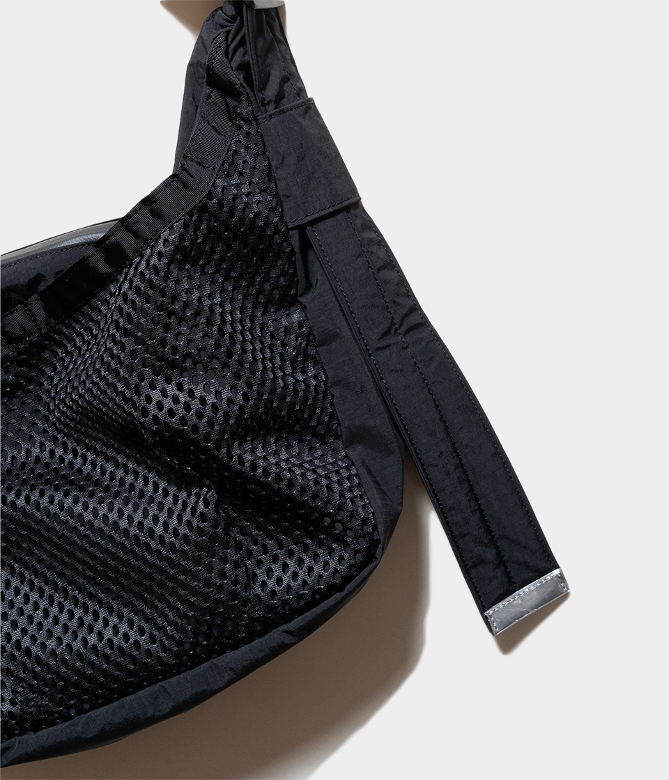 その名の通りさっと肩に掛けて身軽に出かけるためのバッグです。9Lの容量があり13インチのラップトップも入るサイズで、フロントの全面に設けられた外ポケットはメッシュ素材を採用し収納するアイテムによってバッグの表情も変化します。本体内側にはメッシュのインナーポケットを配しスマートフォンやイヤフォン、リップスティックなどの小物の収納に便利です。テープ末端のリフレクターテープもポイントになっています。