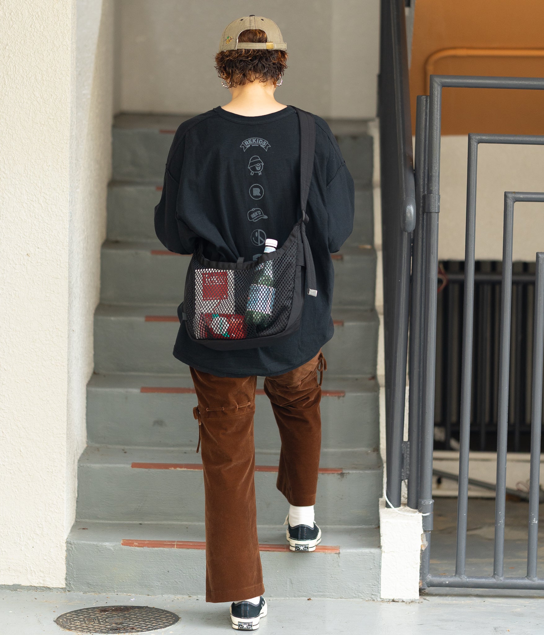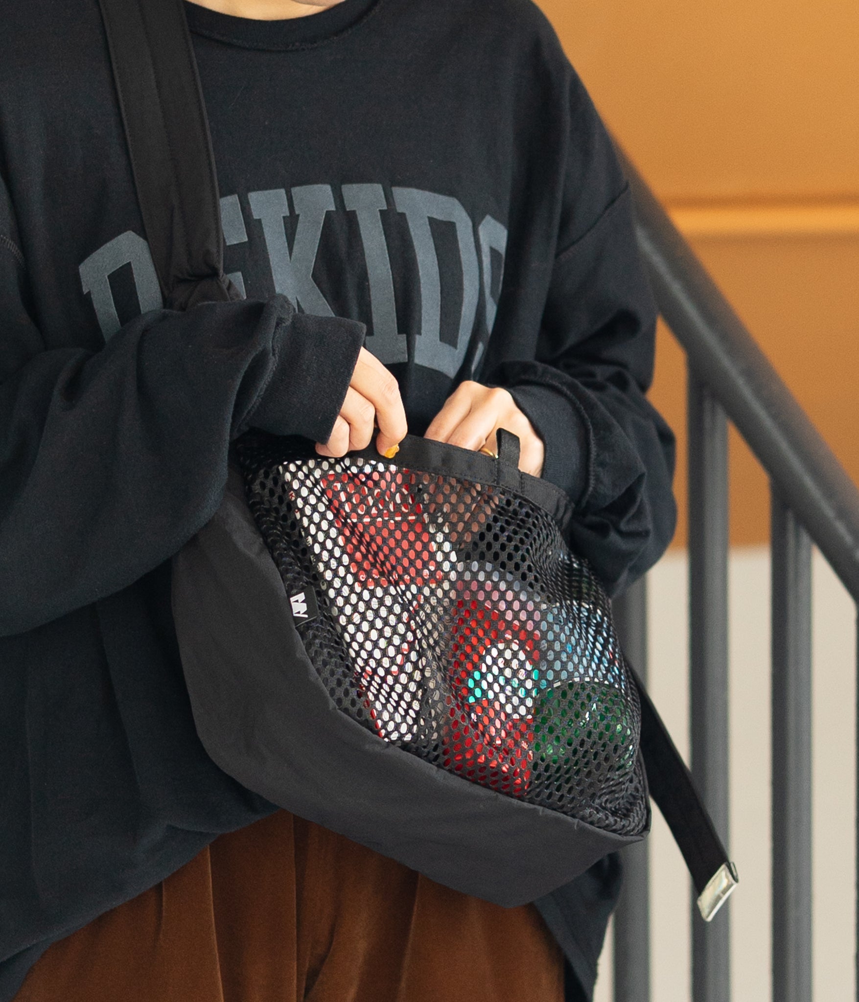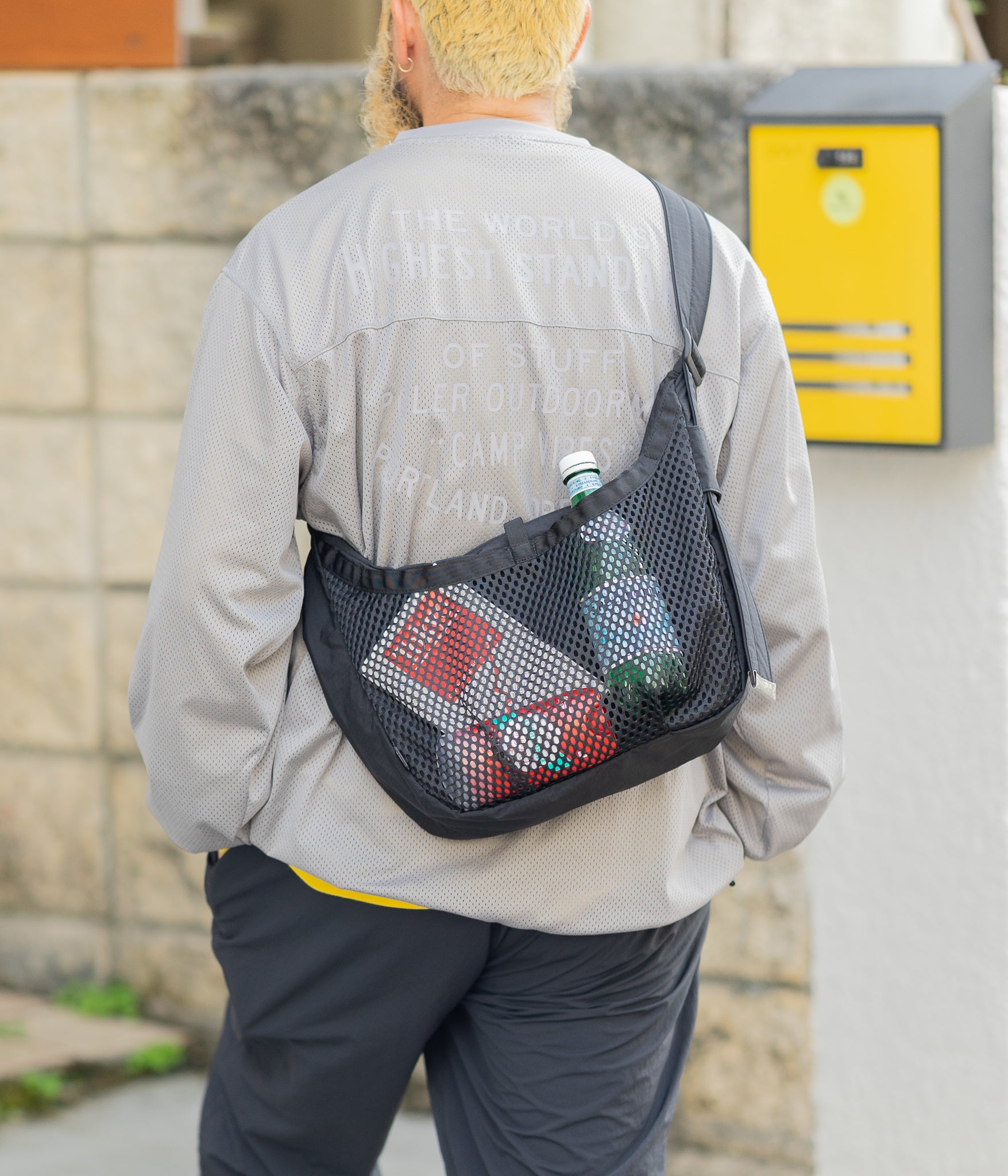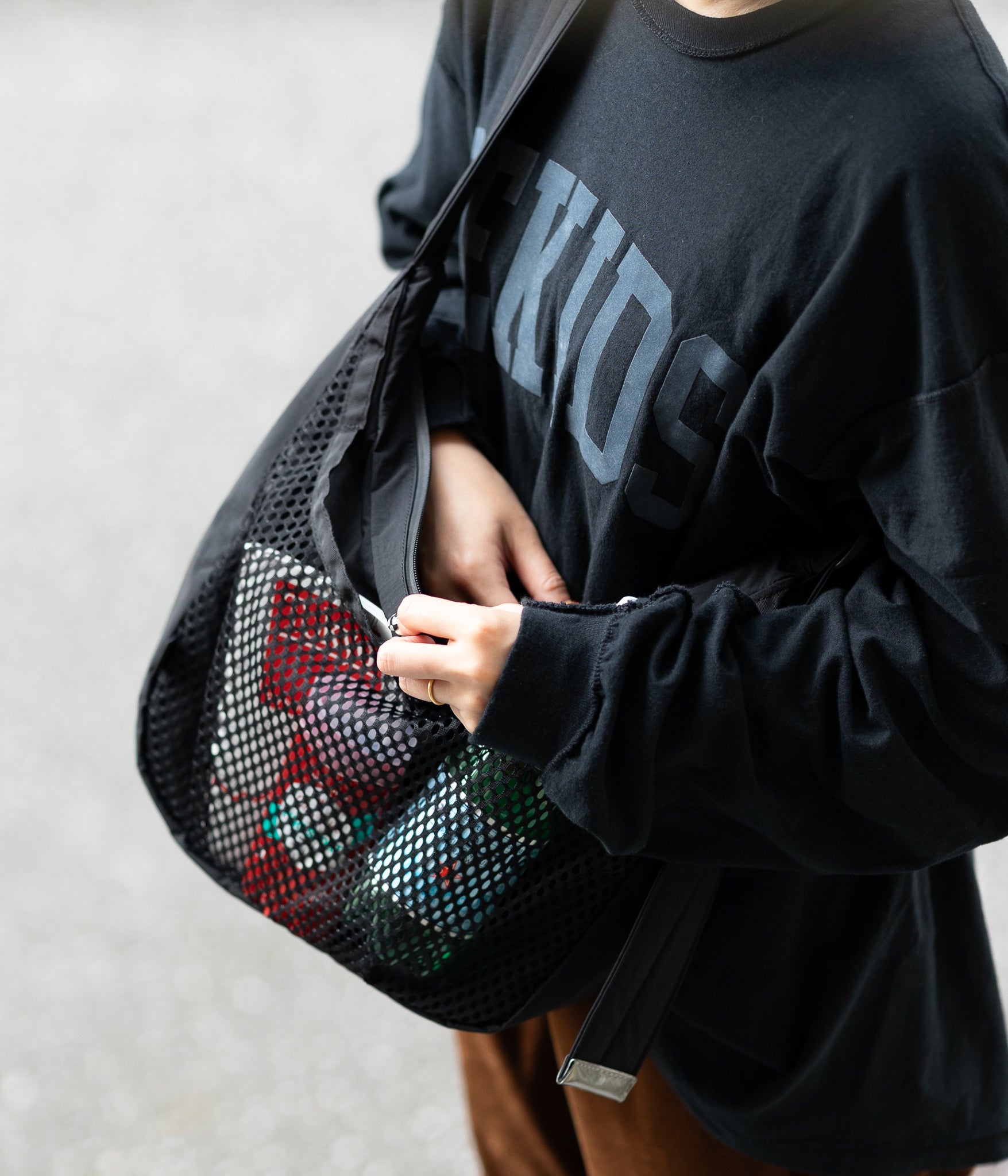 その名の通りさっと肩に掛けて身軽に出かけるためのバッグです。9Lの容量があり13インチのラップトップも入るサイズで、フロントの全面に設けられた外ポケットはメッシュ素材を採用し収納するアイテムによってバッグの表情も変化します。本体内側にはメッシュのインナーポケットを配しスマートフォンやイヤフォン、リップスティックなどの小物の収納に便利です。テープ末端のリフレクターテープもポイントになっています。