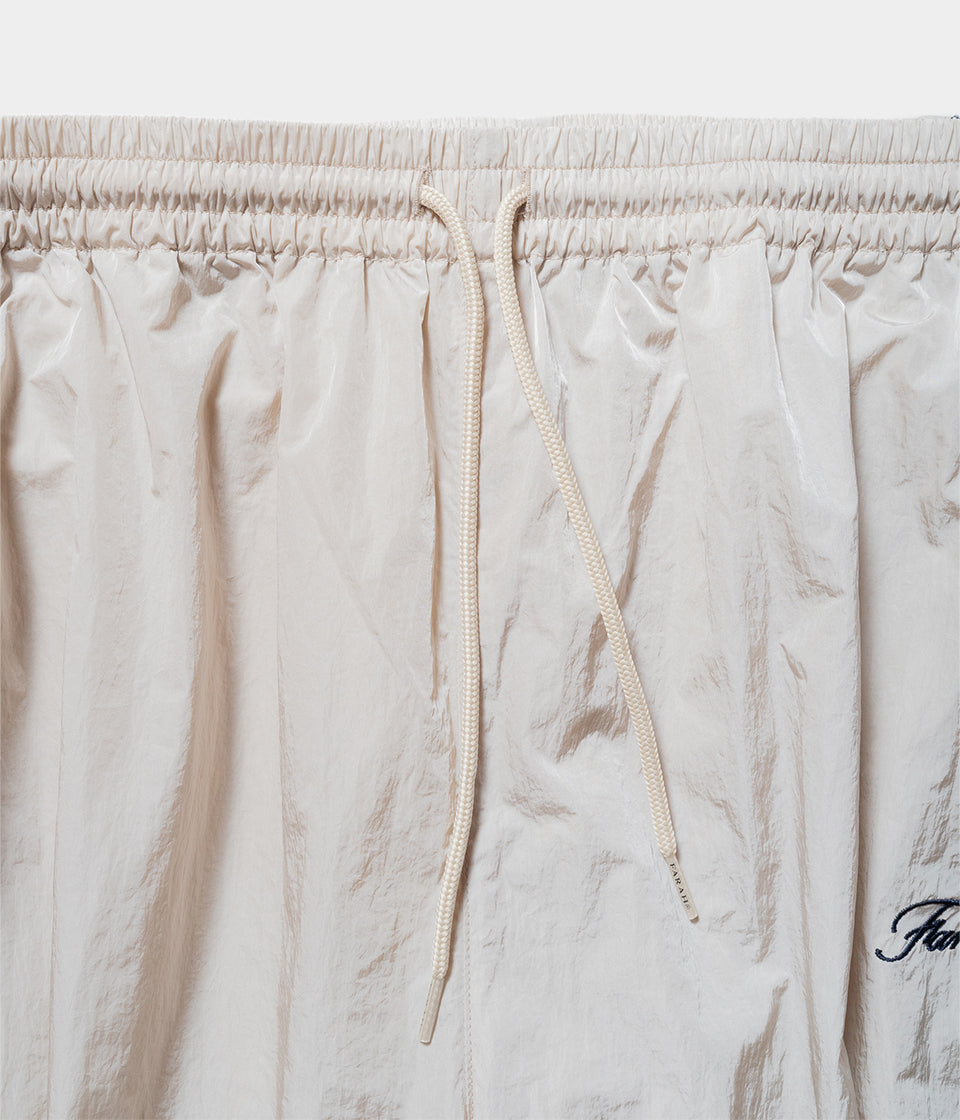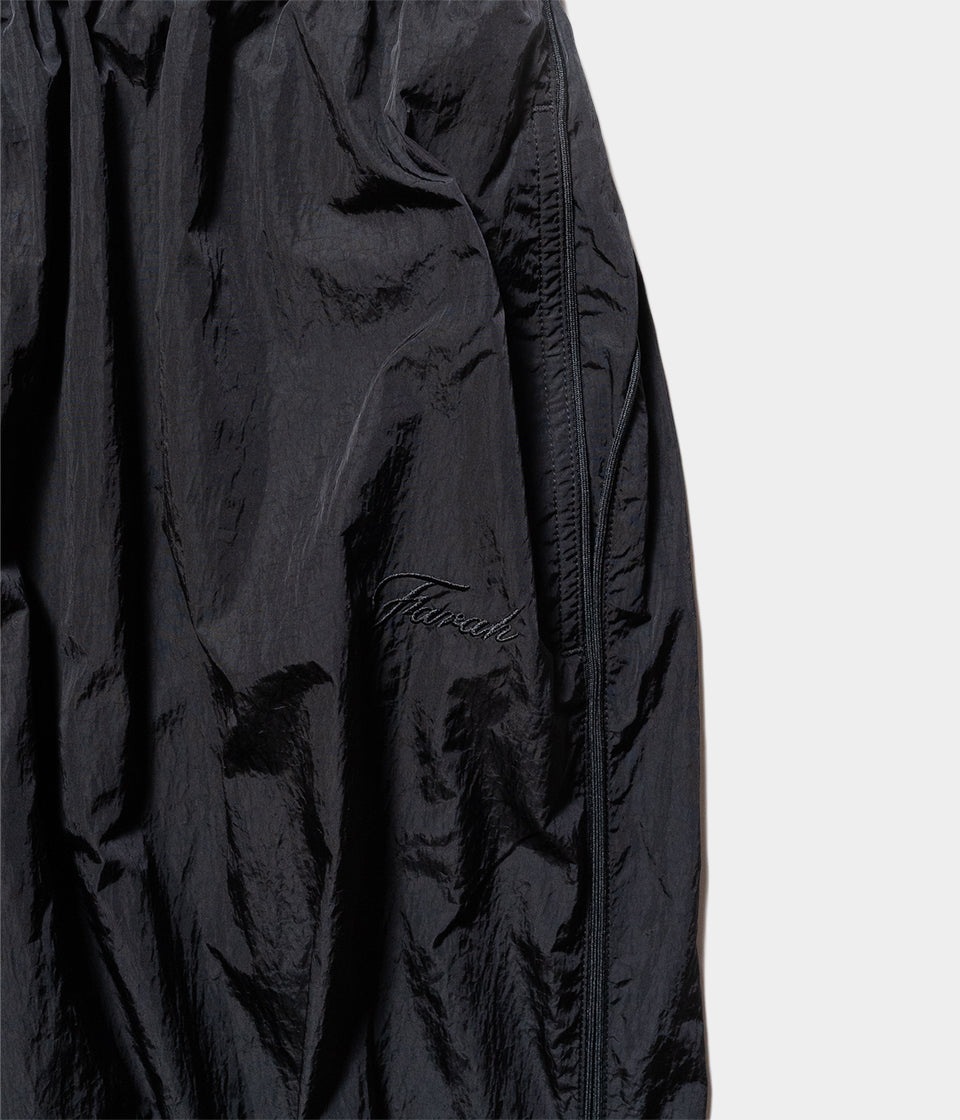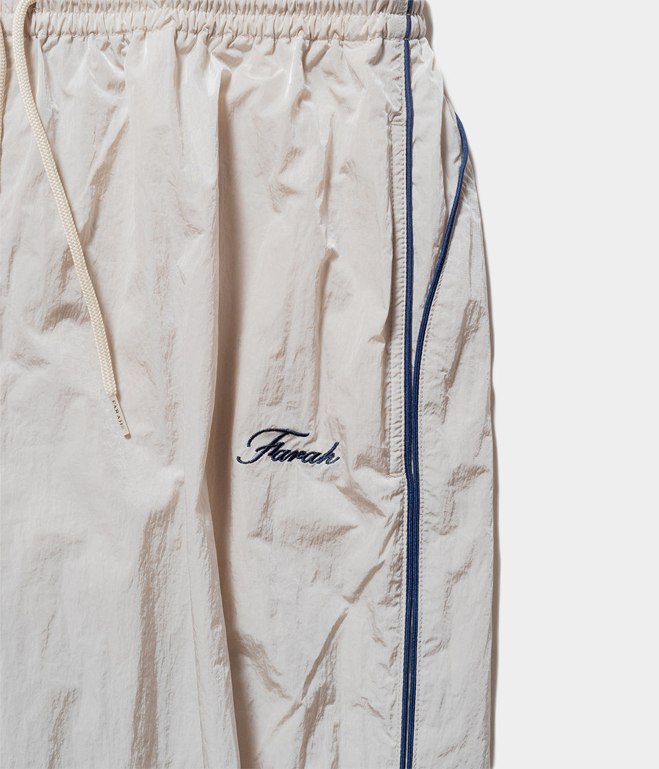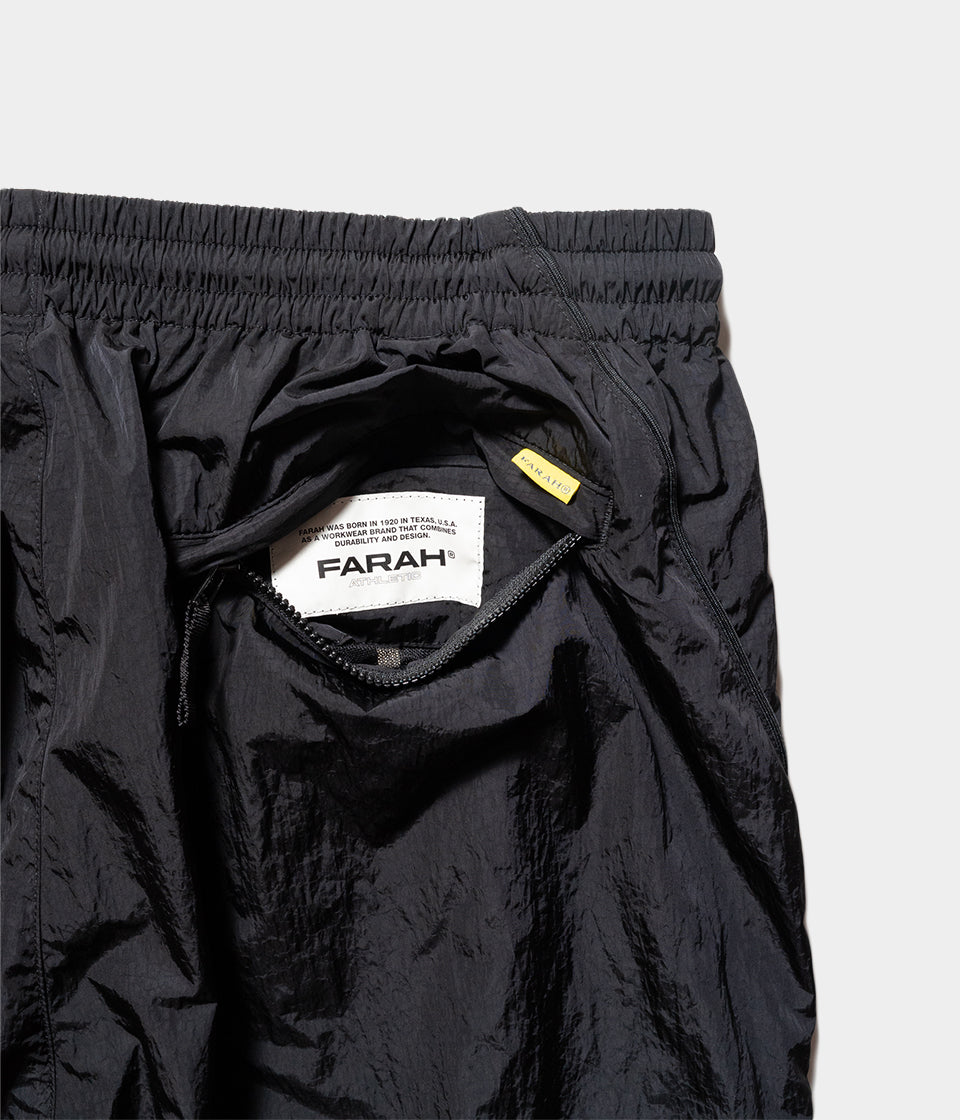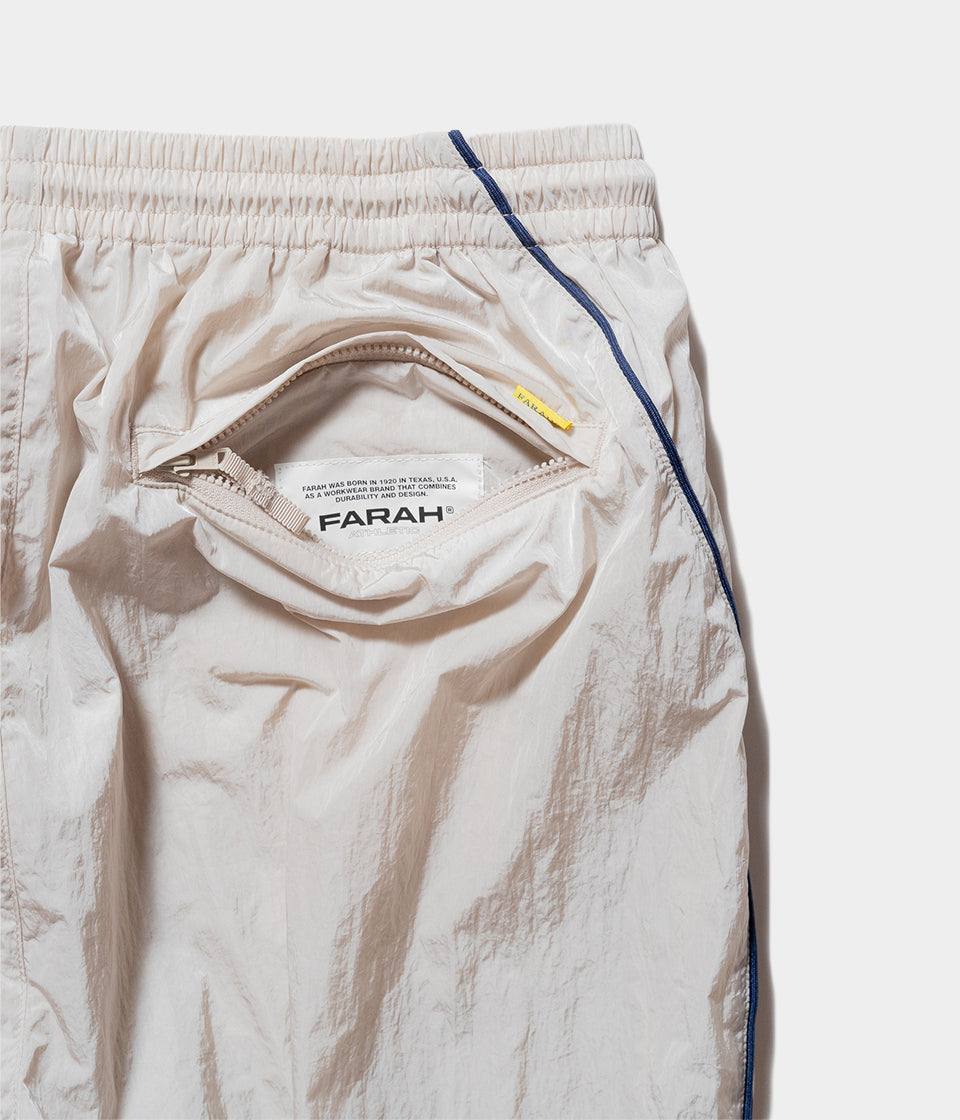 40Dナイロンを使用しており、裏地もメッシュでライトな着心地です。パイピングがいいアクセントとなり、上品な光沢感がありながらも陰影が生まれるヴィンテージワッシャー加工が施されています。ウエストはドローコードで調節可能。フロント部分にはワンポイントでFARAHの刺繍が入ります。