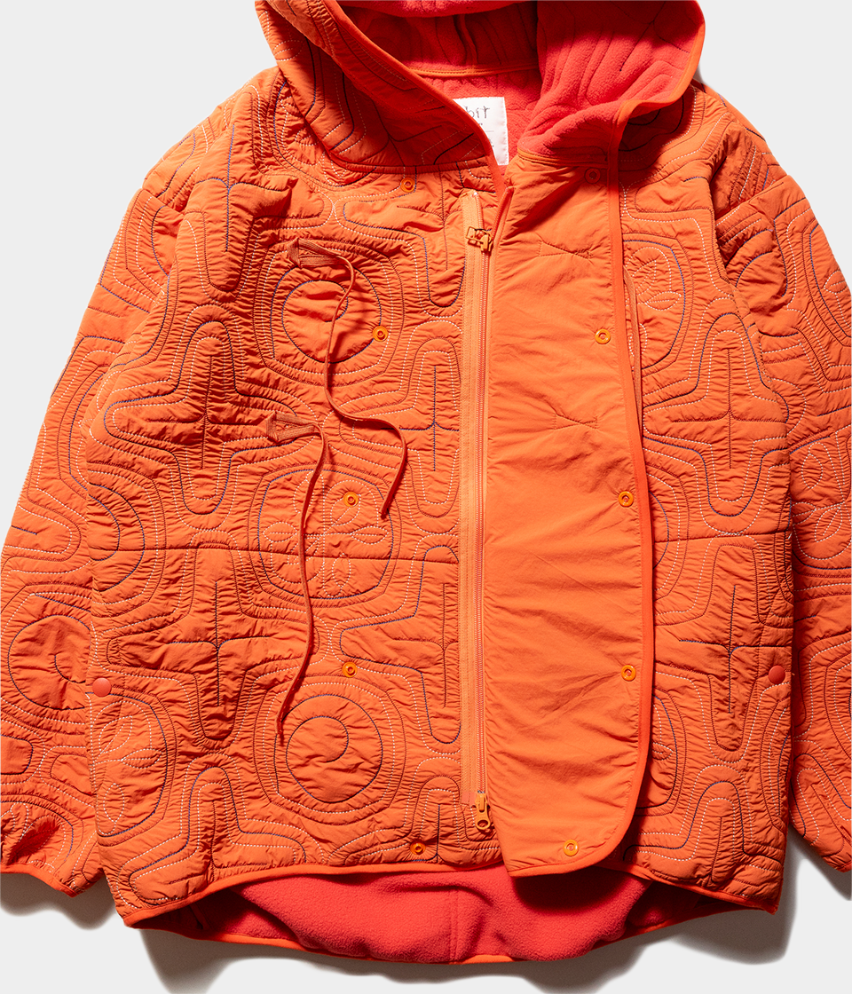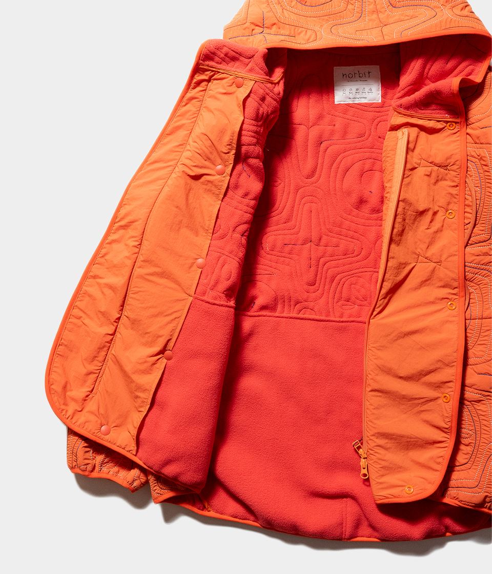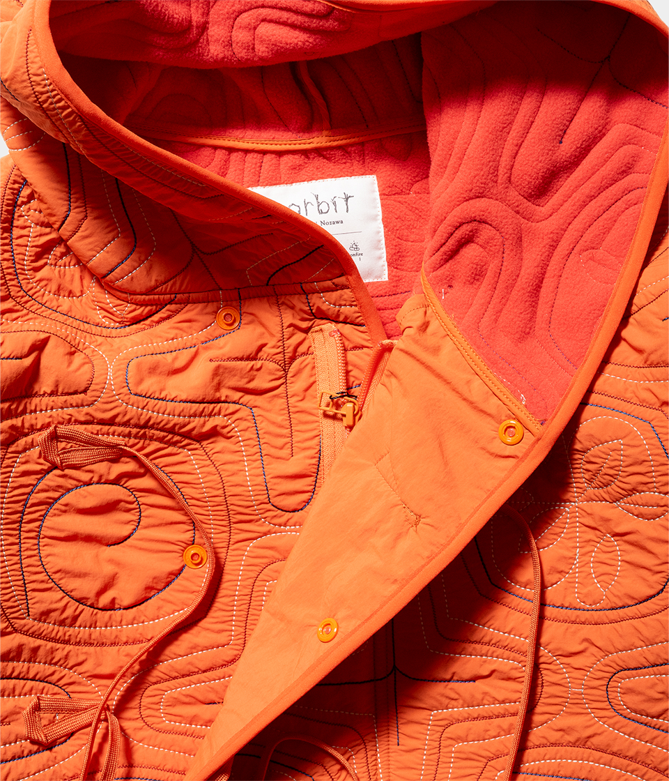 撥水ナイロン素材とポリエステルフリースを日本古来のアイヌ柄イメージのキルティングを施したフードジャケット。ベースデザインはnorbitの定番とも言えるフロントダブルループのフードジャケットを採用しています。フリースの暖かさと防風機能も備えた軽量で着回しの良いアイテムです。