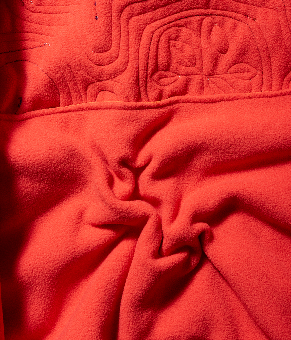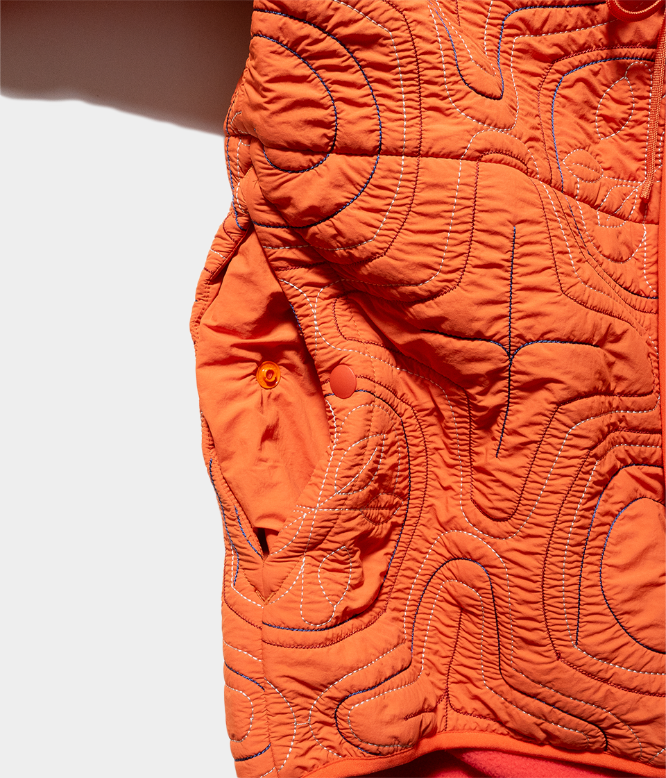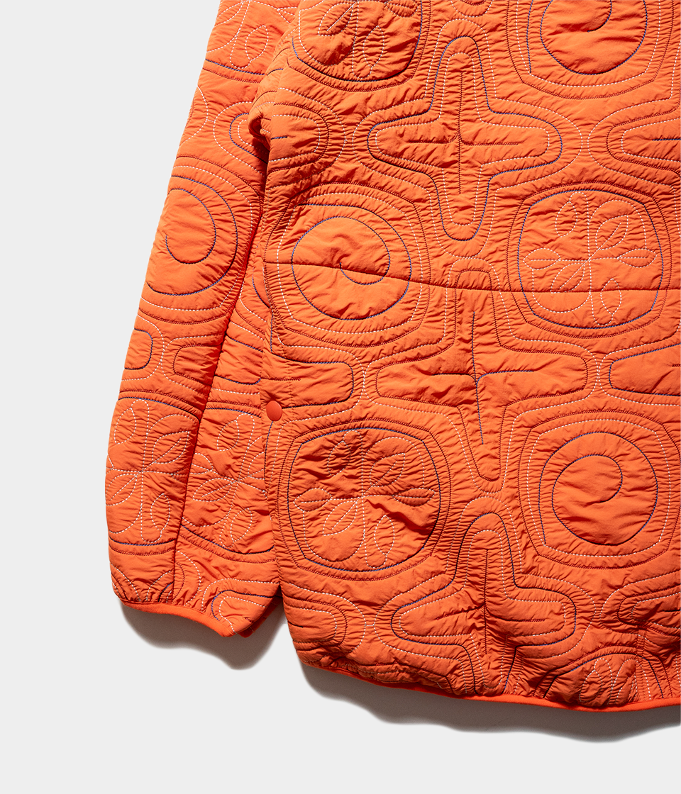 撥水ナイロン素材とポリエステルフリースを日本古来のアイヌ柄イメージのキルティングを施したフードジャケット。ベースデザインはnorbitの定番とも言えるフロントダブルループのフードジャケットを採用しています。フリースの暖かさと防風機能も備えた軽量で着回しの良いアイテムです。