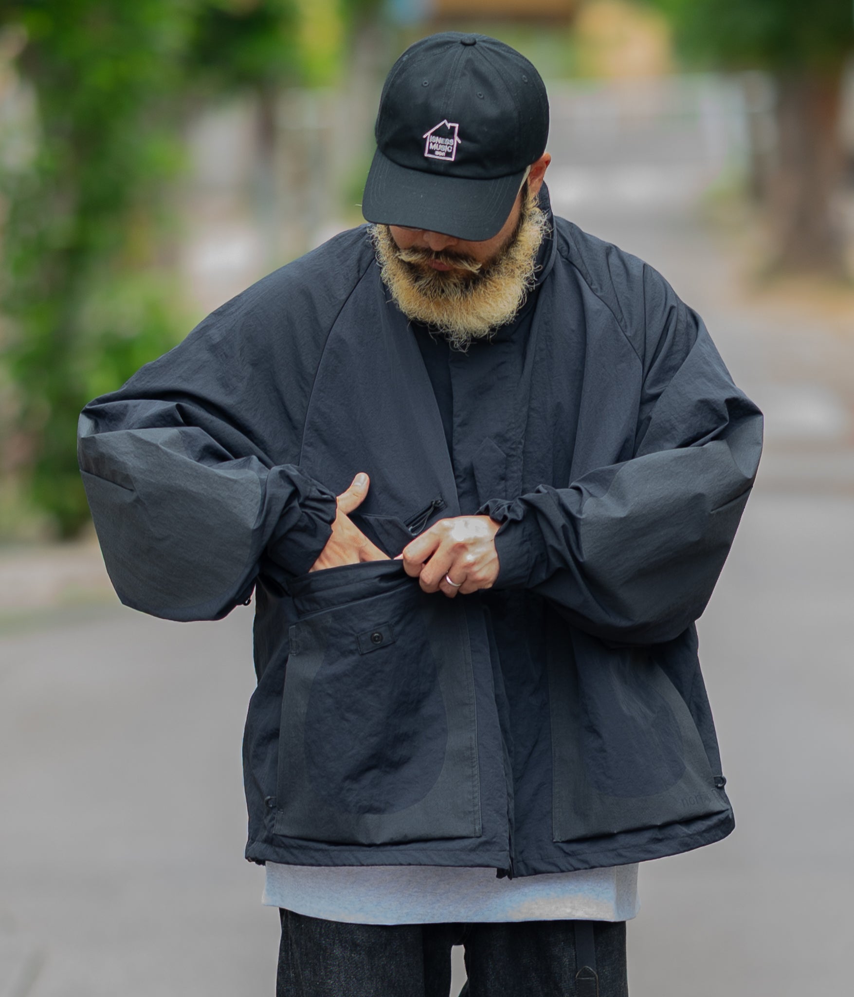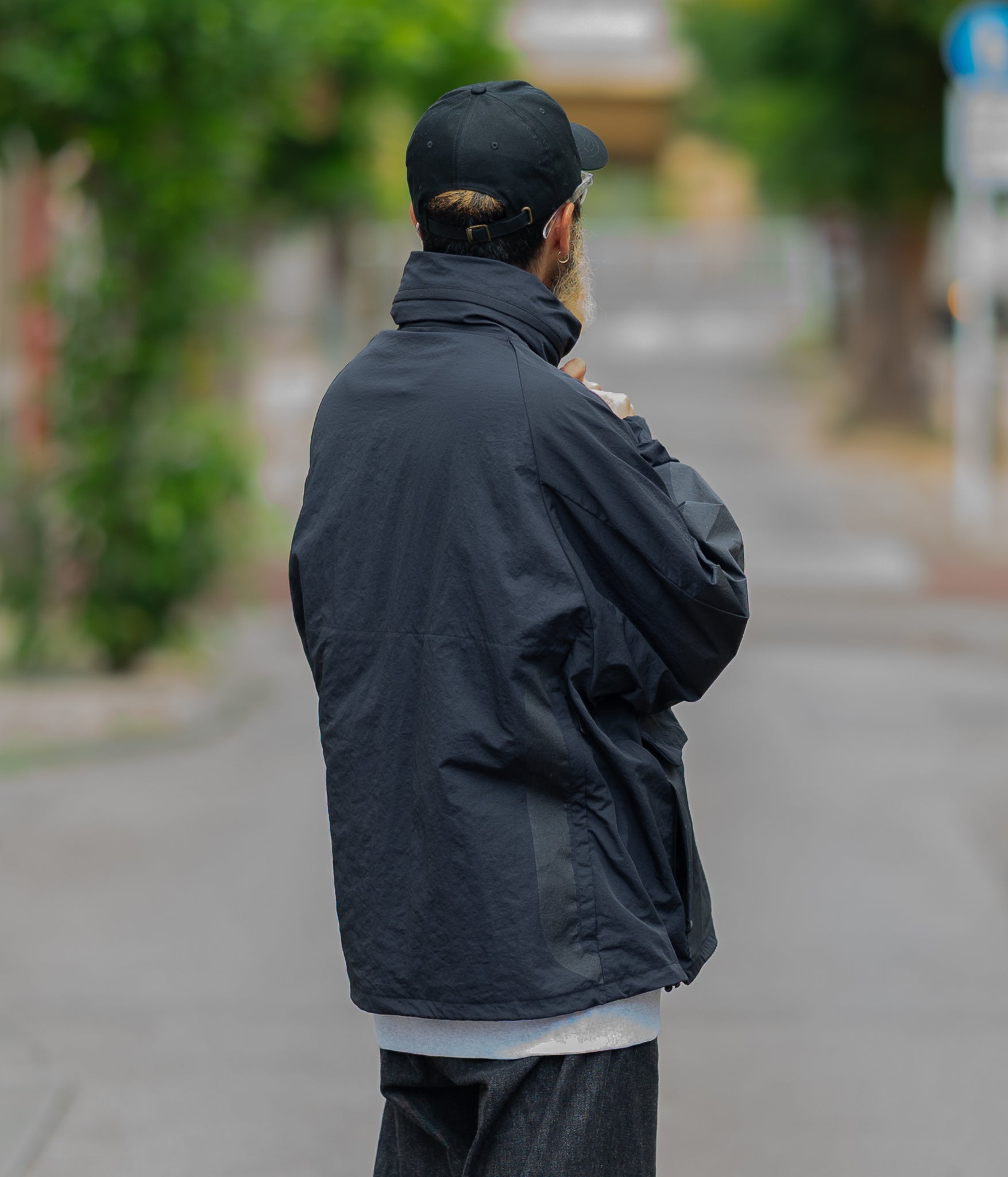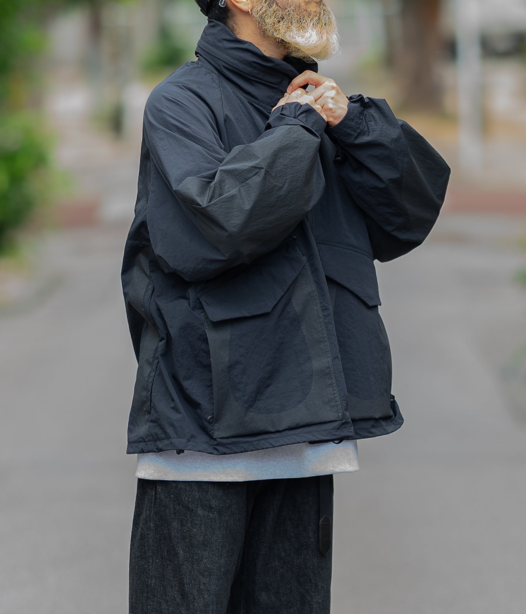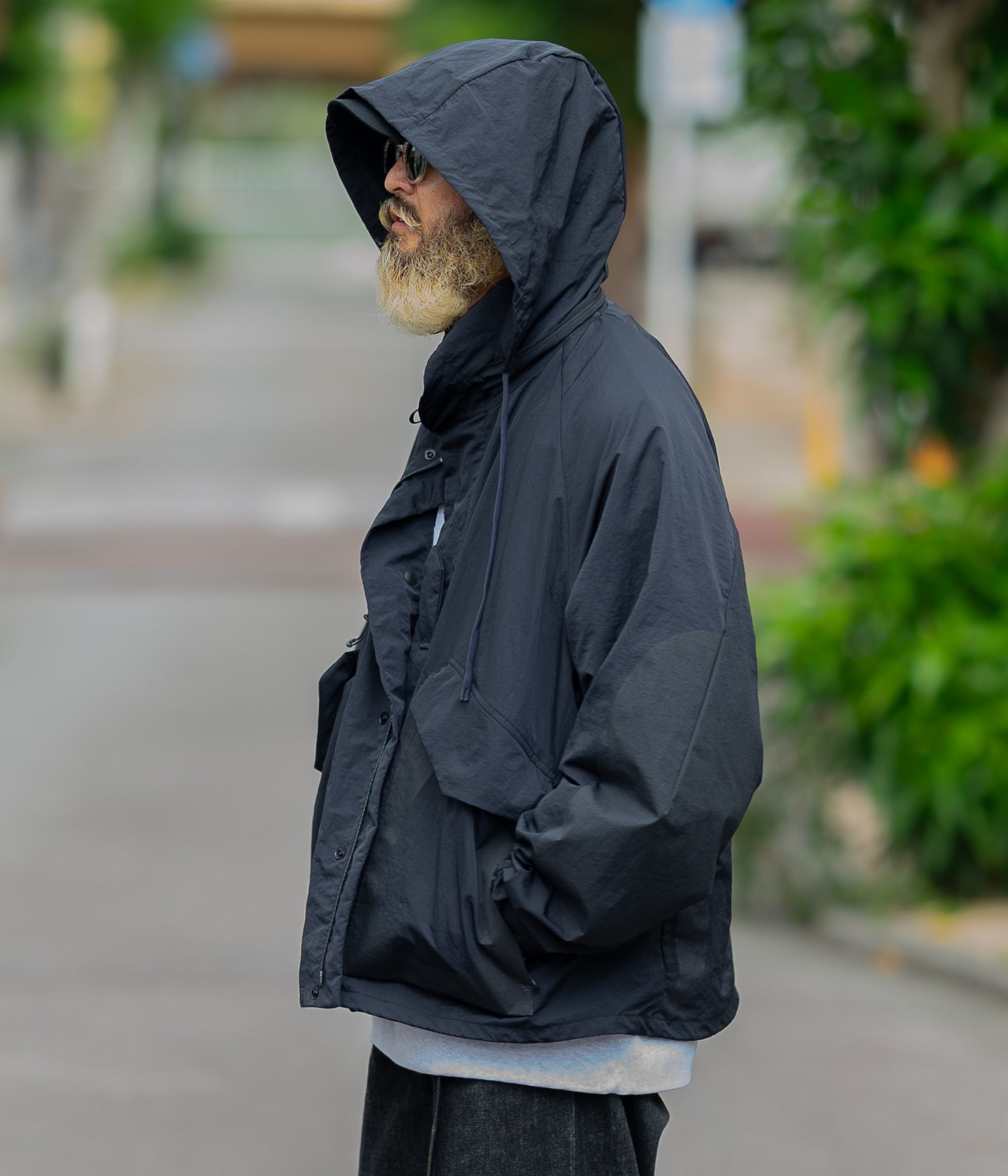 W/R 100%リサイクルナイロン(パウダータッチの塩縮ナイロン)使用のフィールドジャケット。エルボパッチ、ポケット入り口部に補強用プリントをデザインアクセントとして採用。ワイドショートシルエットでフード収納型スタンドカラー、フロントポケットはウォームポケット付き3ウェイ、バックポケットはゲームポケットとnoritらしいポケットワークも特徴のアイテムです。