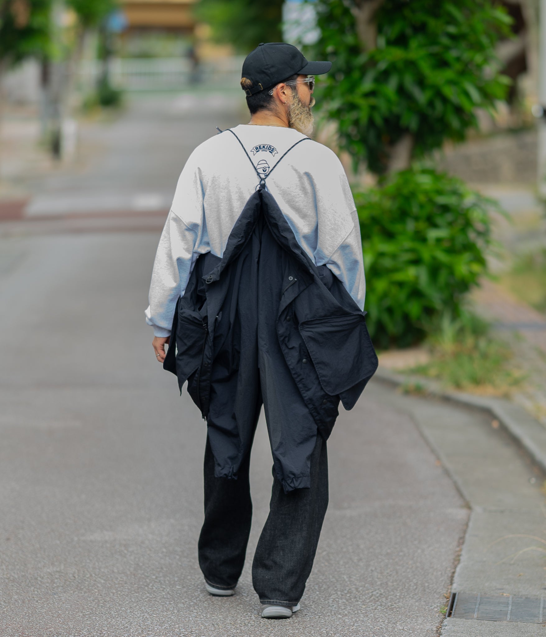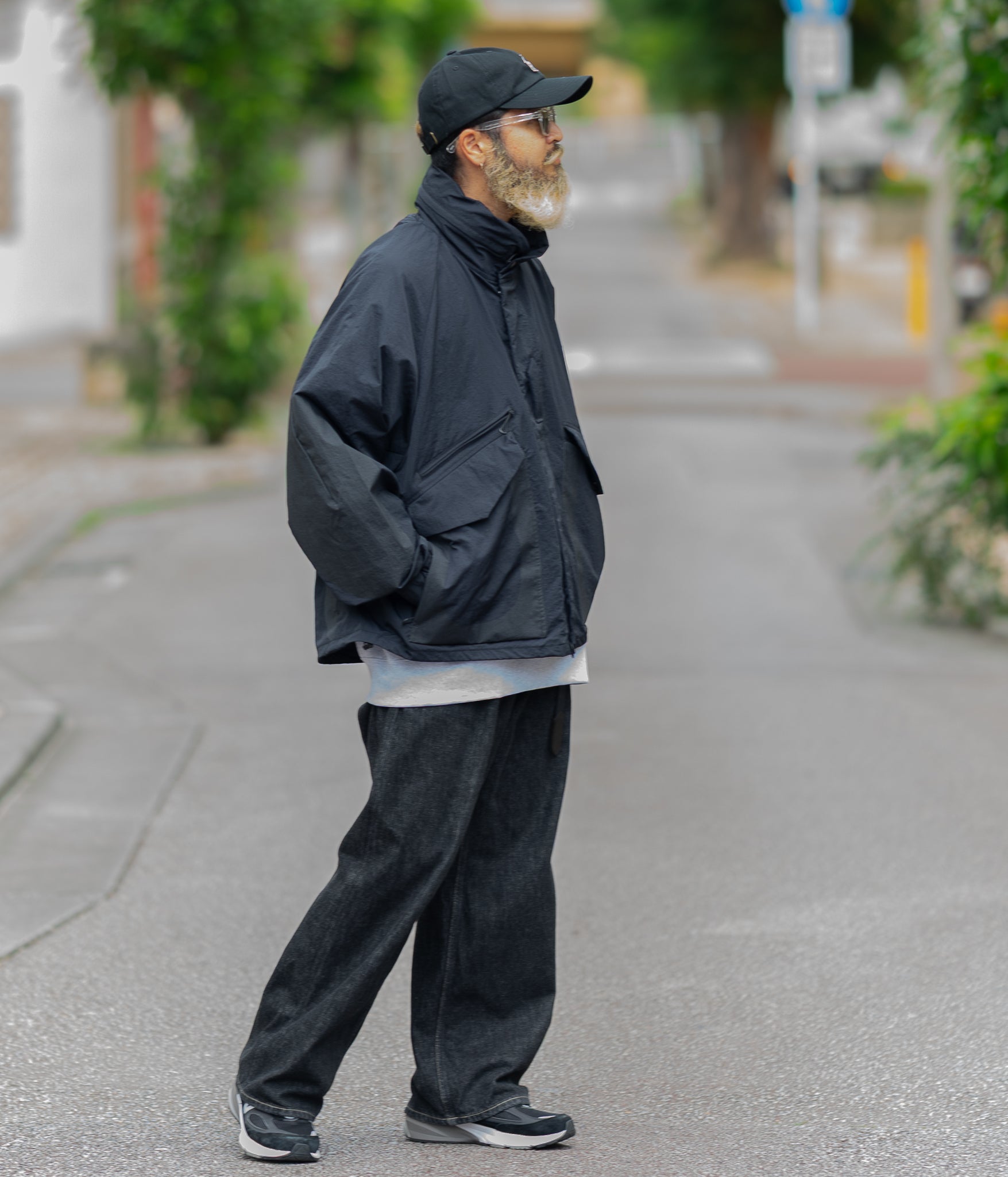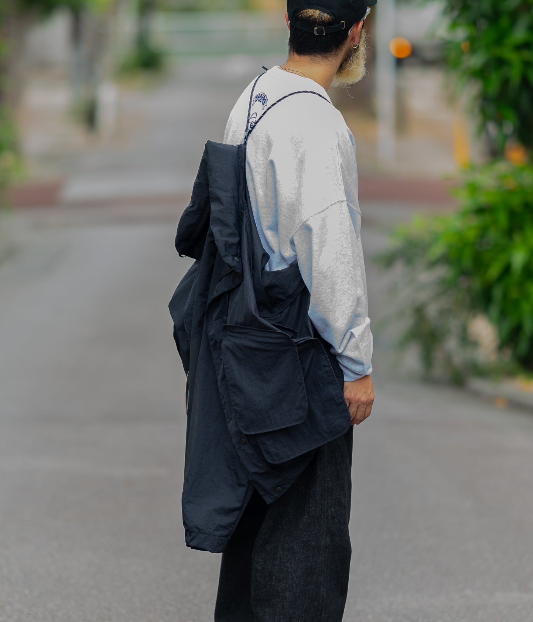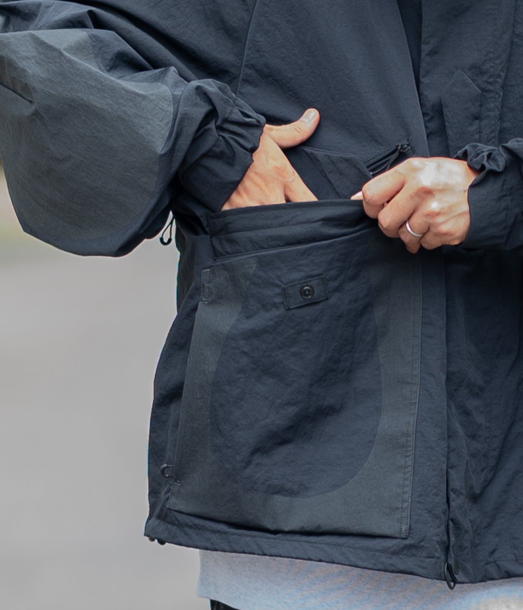 W/R 100%リサイクルナイロン(パウダータッチの塩縮ナイロン)使用のフィールドジャケット。エルボパッチ、ポケット入り口部に補強用プリントをデザインアクセントとして採用。ワイドショートシルエットでフード収納型スタンドカラー、フロントポケットはウォームポケット付き3ウェイ、バックポケットはゲームポケットとnoritらしいポケットワークも特徴のアイテムです。