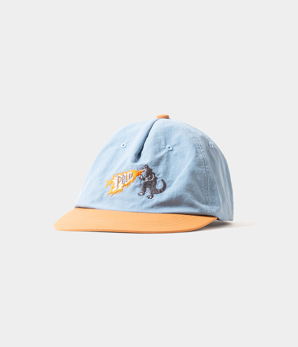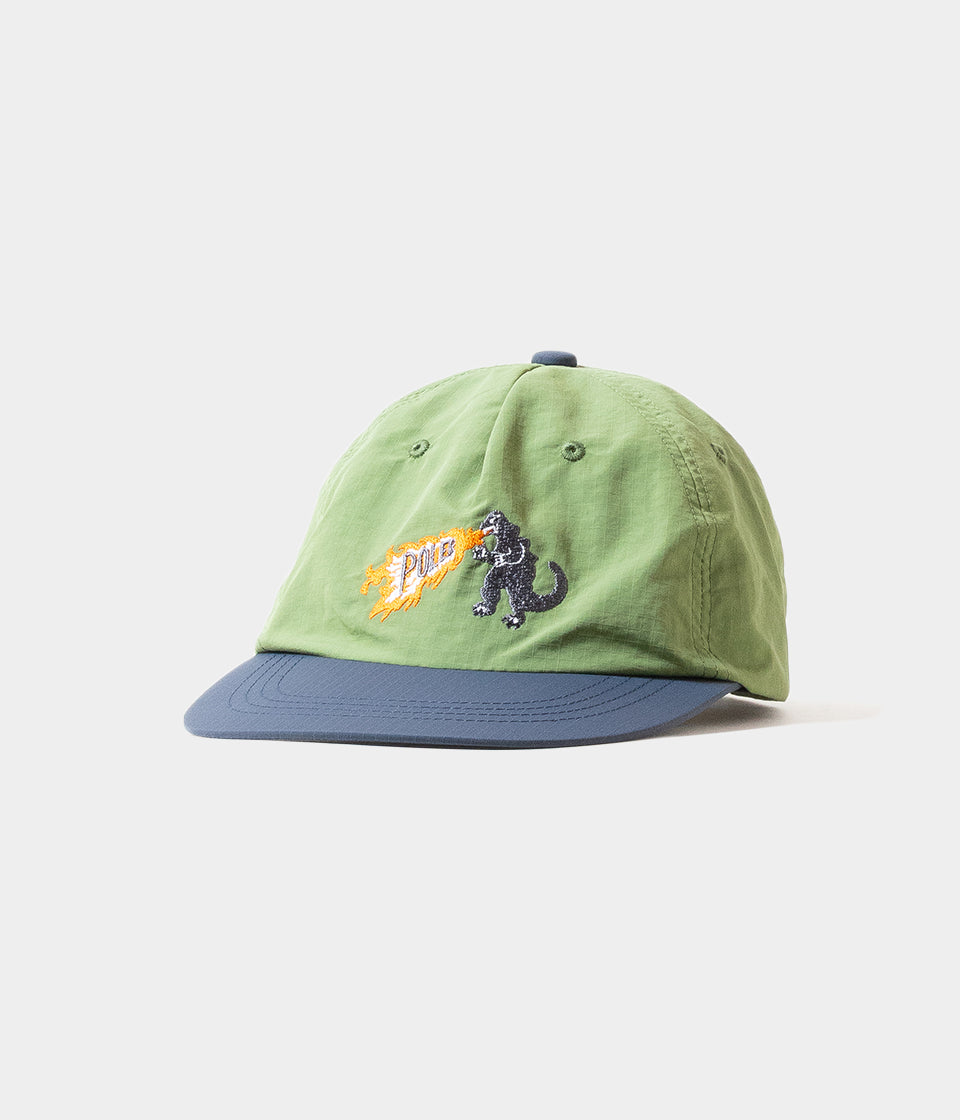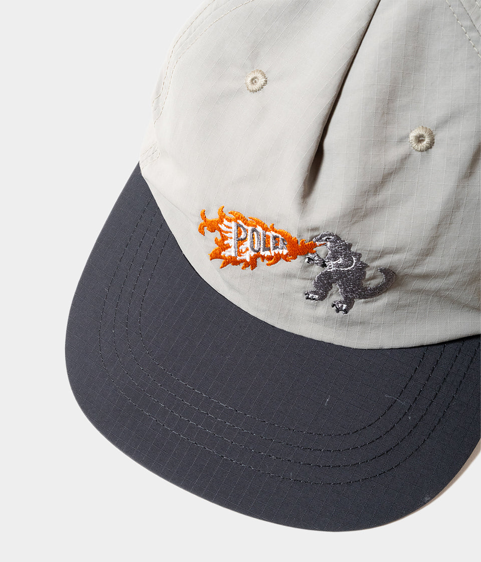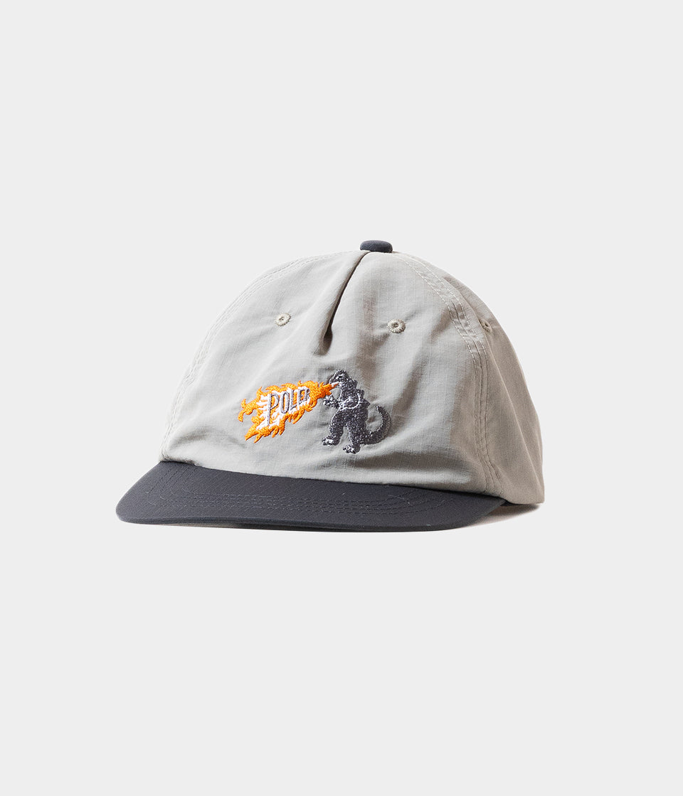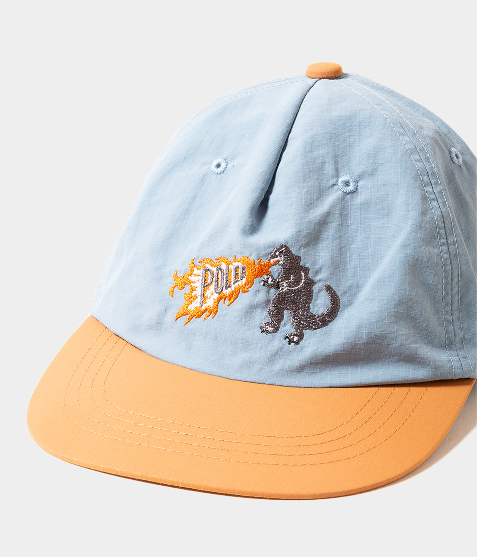 フロントにPOLERの文字の炎を吐く恐竜が刺繍されたナイロン製の6パネルキャップです。