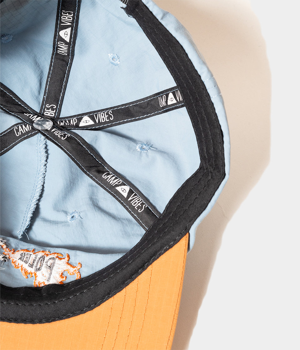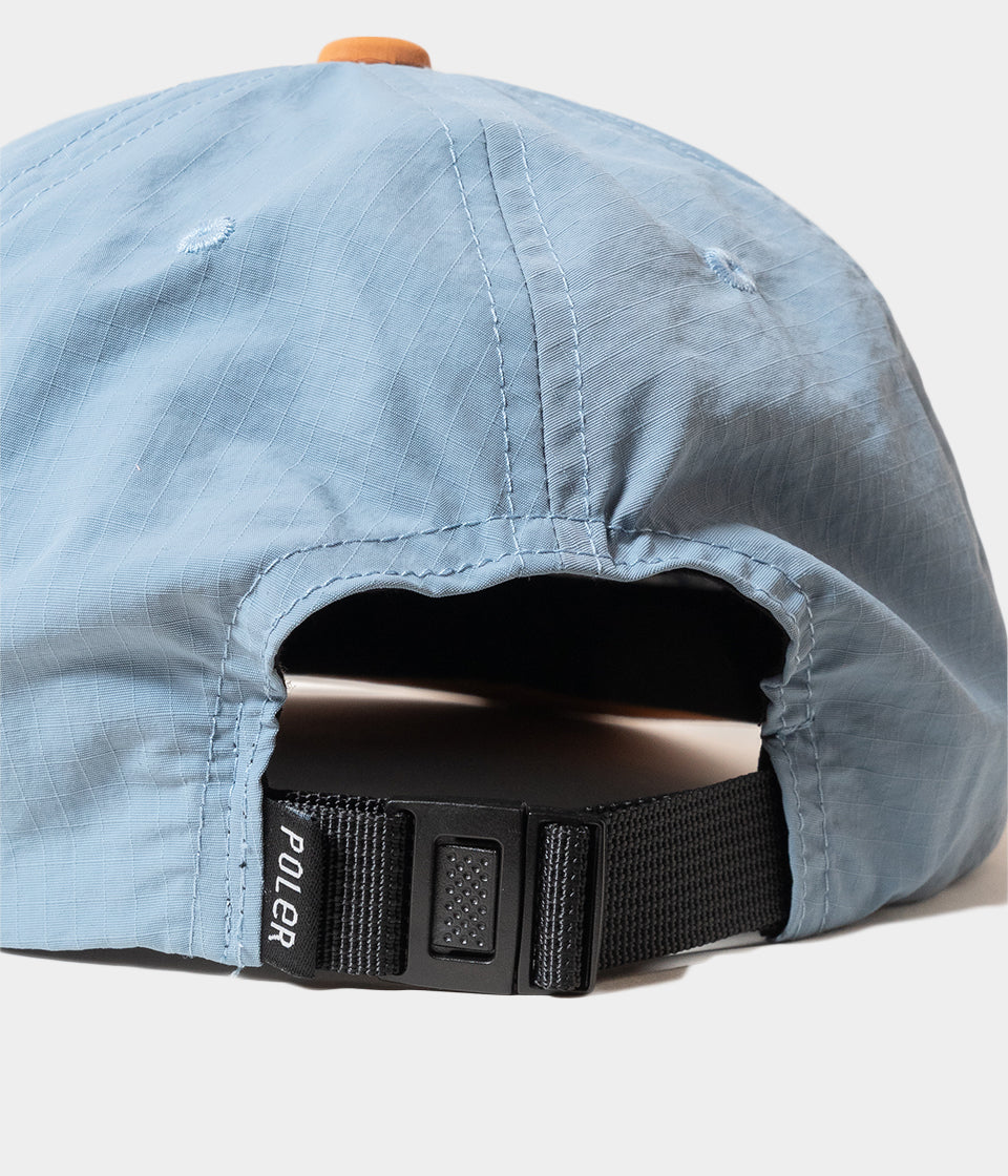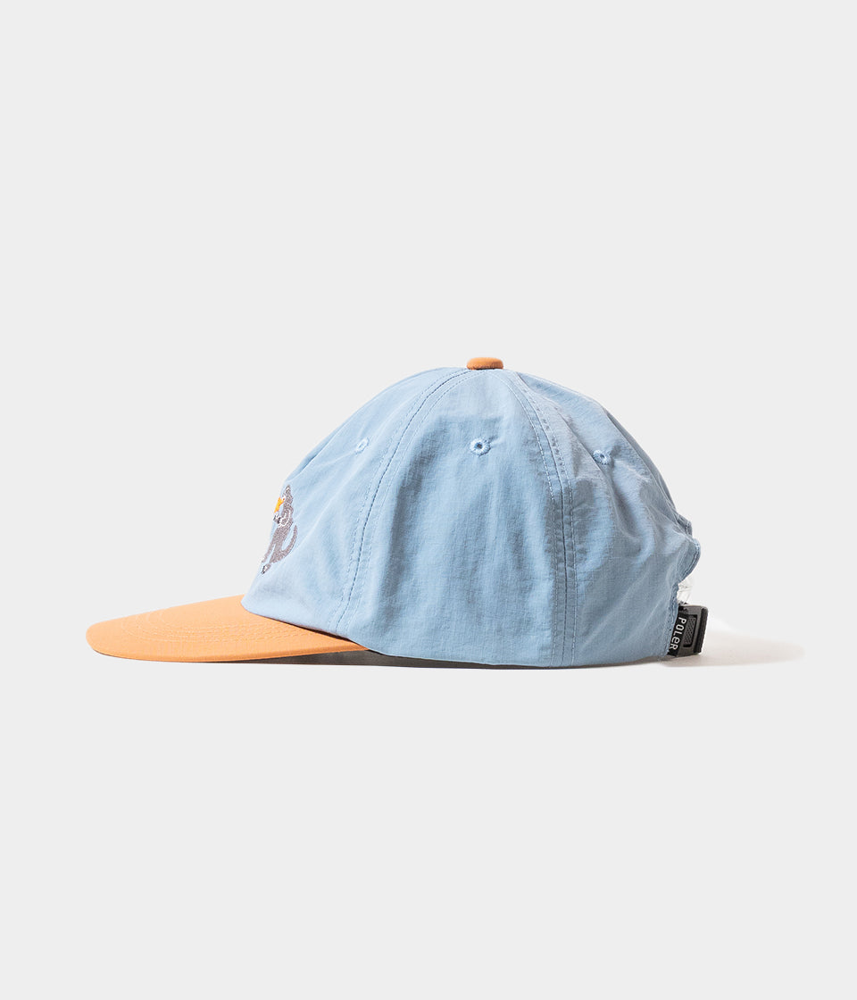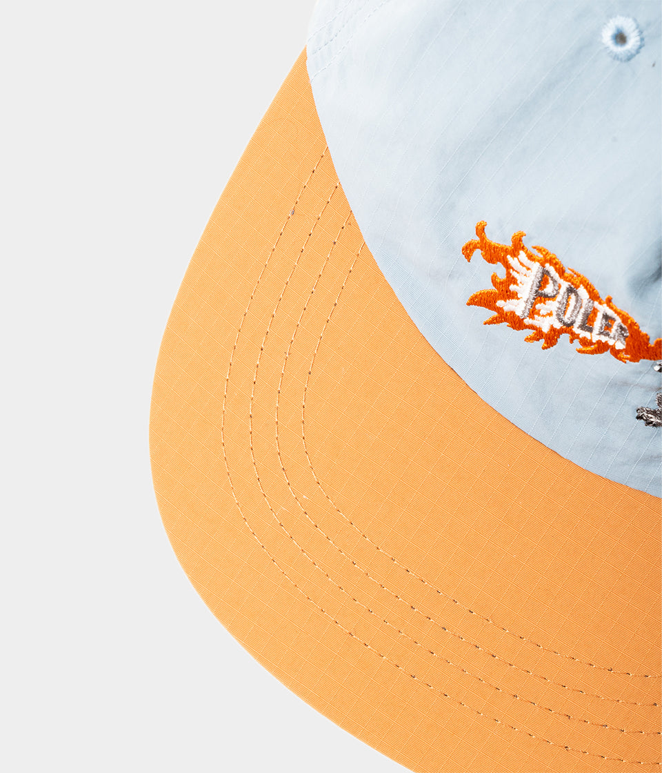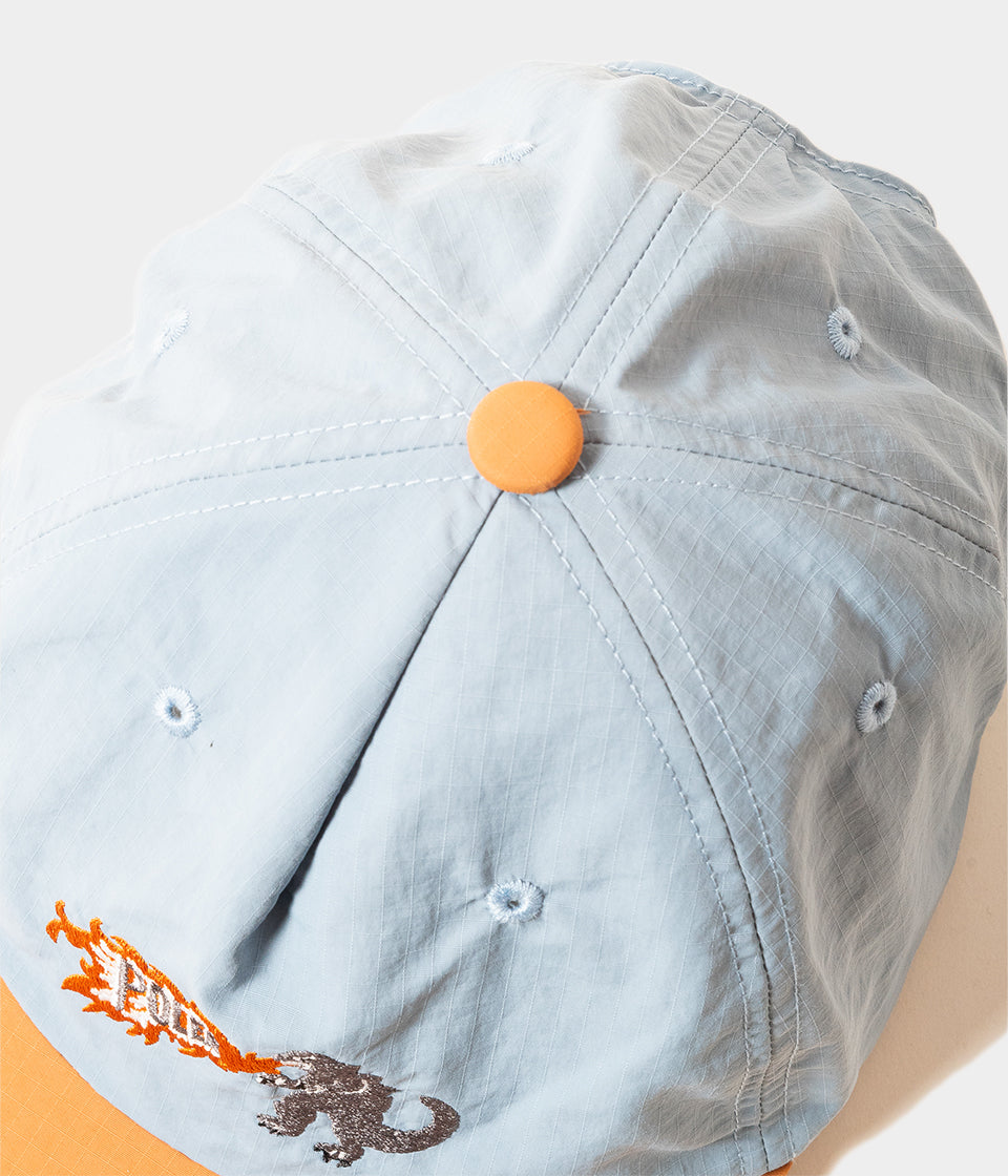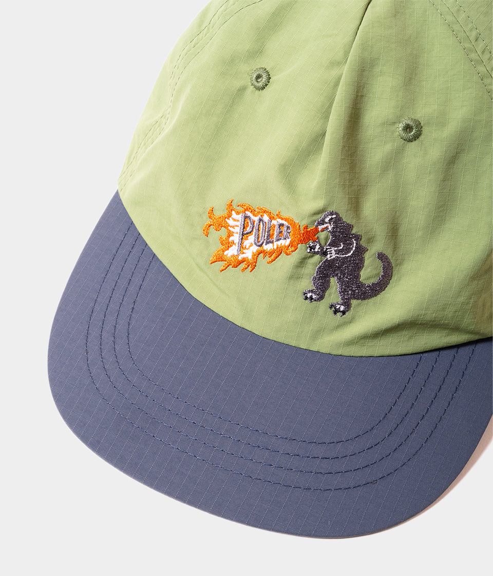 フロントにPOLERの文字の炎を吐く恐竜が刺繍されたナイロン製の6パネルキャップです。