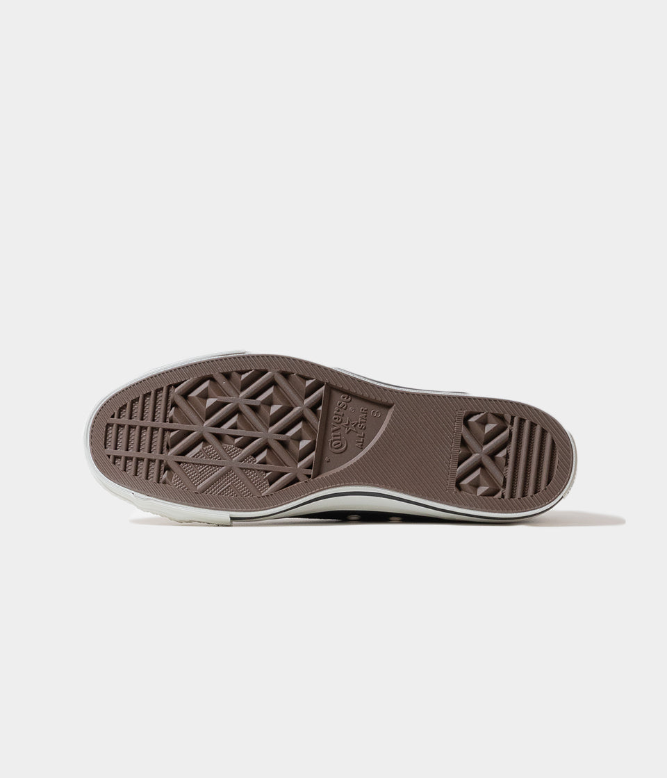 80年代のラストを使用したシャープなシルエットが特徴。生成りのテープやコットンシューレースがクラシックな印象を演出。ヒールラベルの下部に印字した「MADE IN JAPAN」の文字、日本国旗をイメージして赤字で印したインソールのコンバースロゴがポイント。インソールにはクッション性と反発性に優れるラバースポンジを採用。国産のオリジナルカートン仕様。カラーはブラックの1カラー展開。