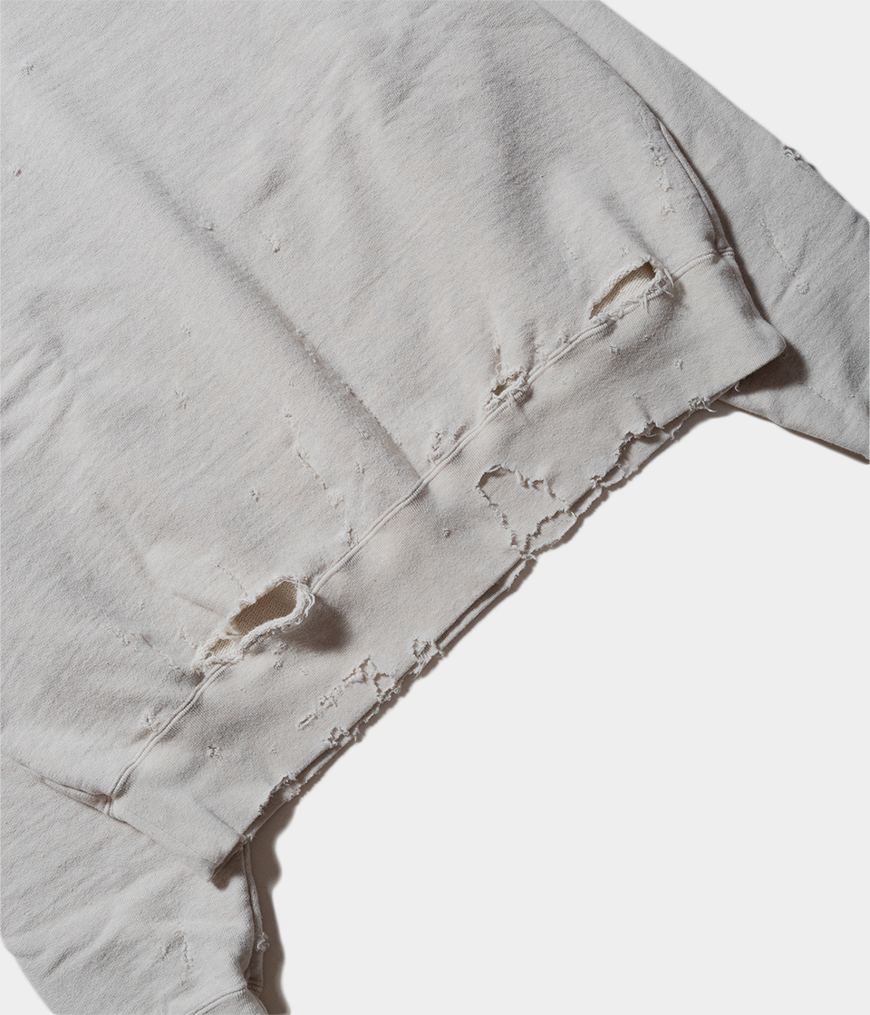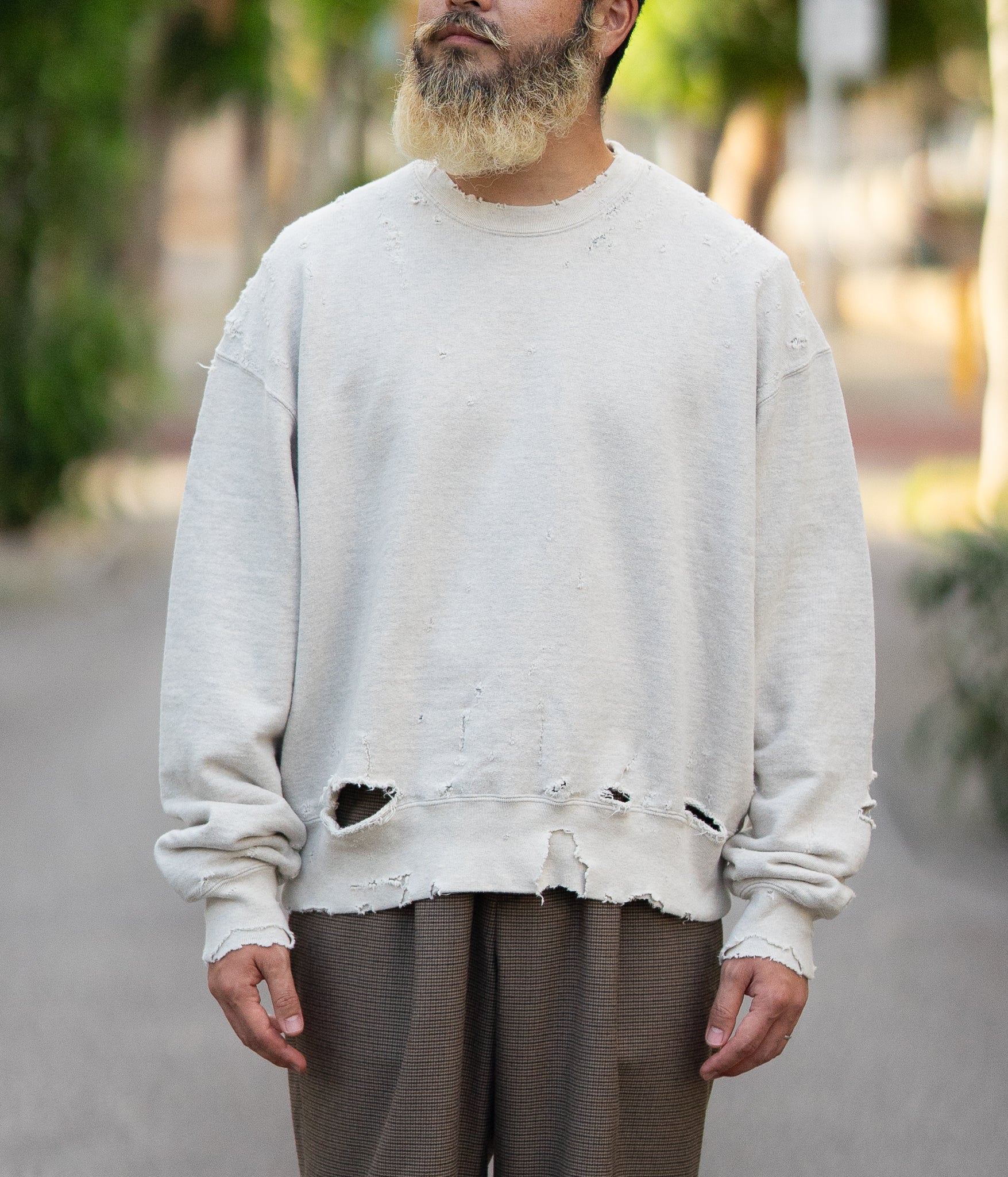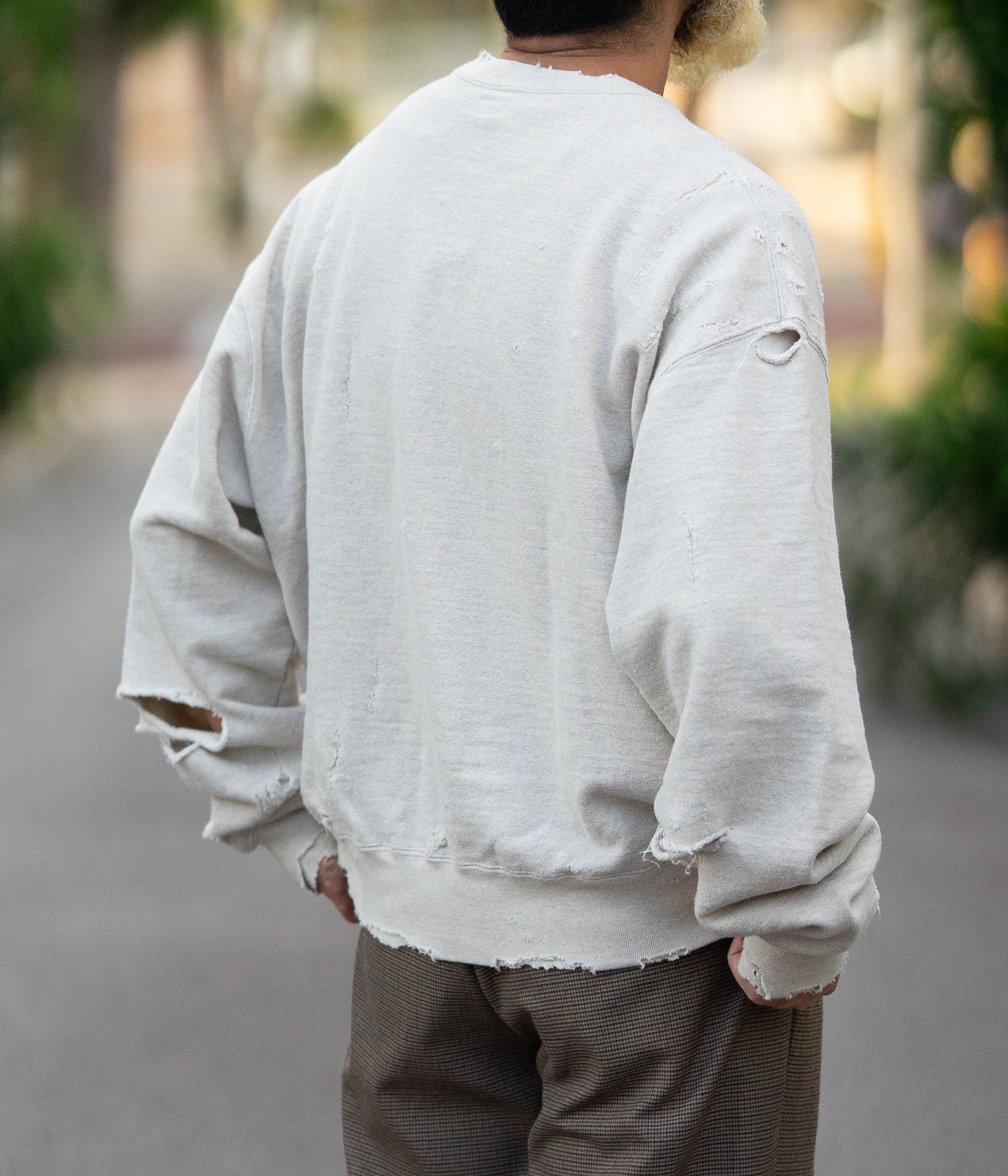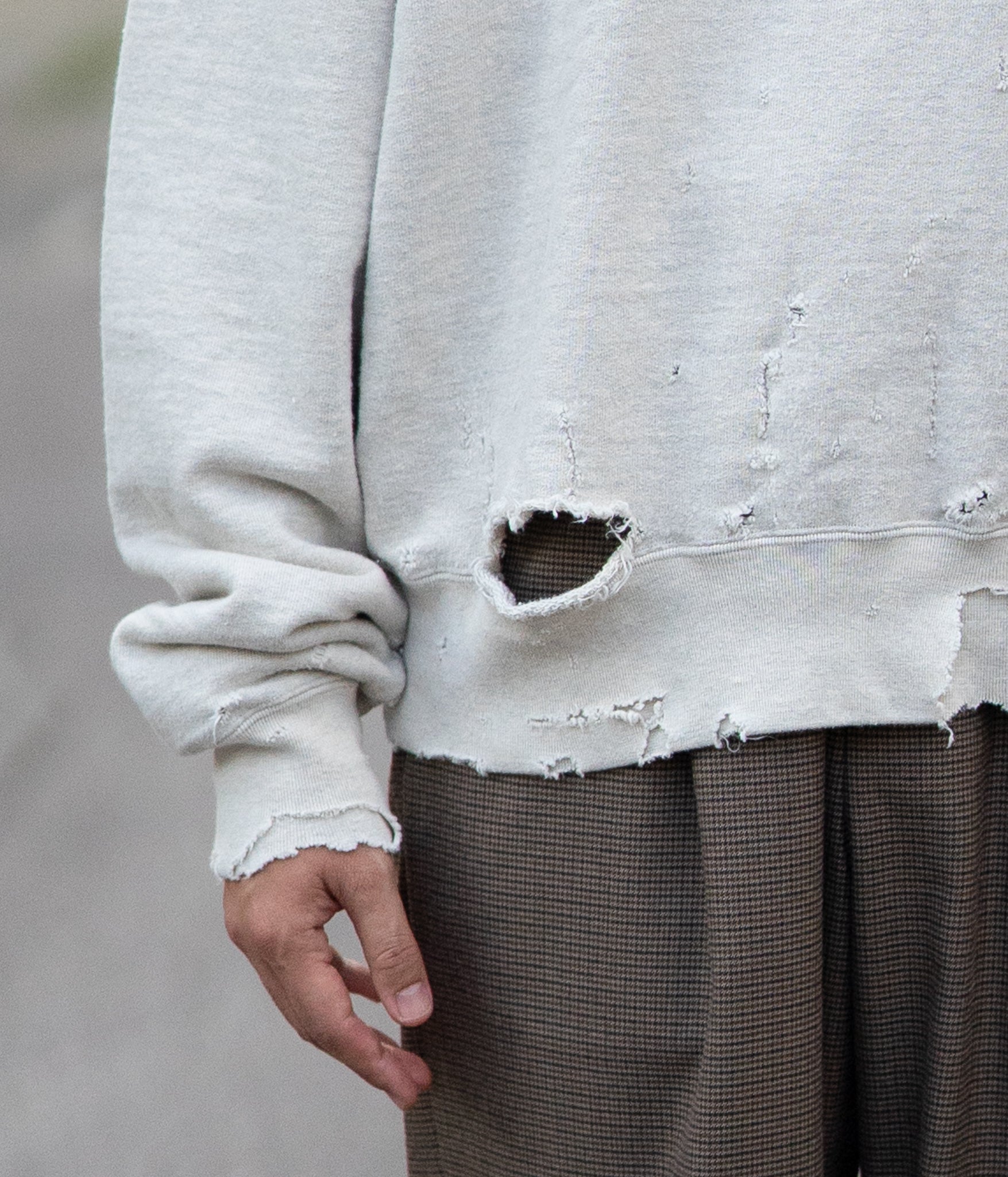 このダメージスウェットは、染め加工によって生まれる自然な風合いが特徴です。ダメージリペアが丁寧に施され、それぞれの部位に職人の手作業による修復が施され、一点ものの個性を際立たせています。製造には特殊な手法は一切使用されず、アナログな手法のみが用いられています。