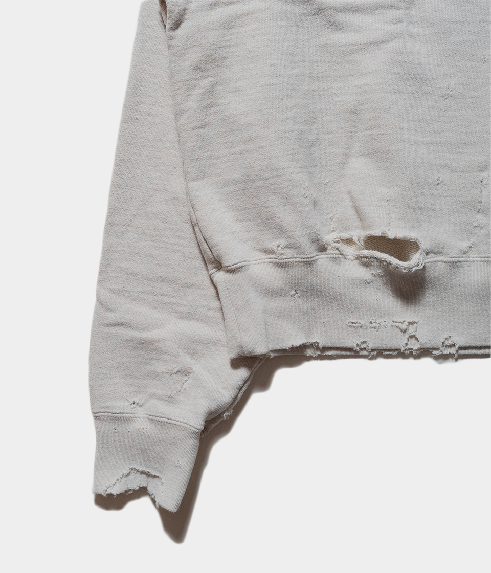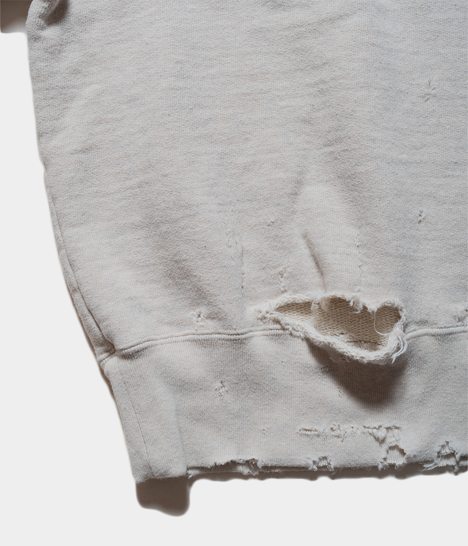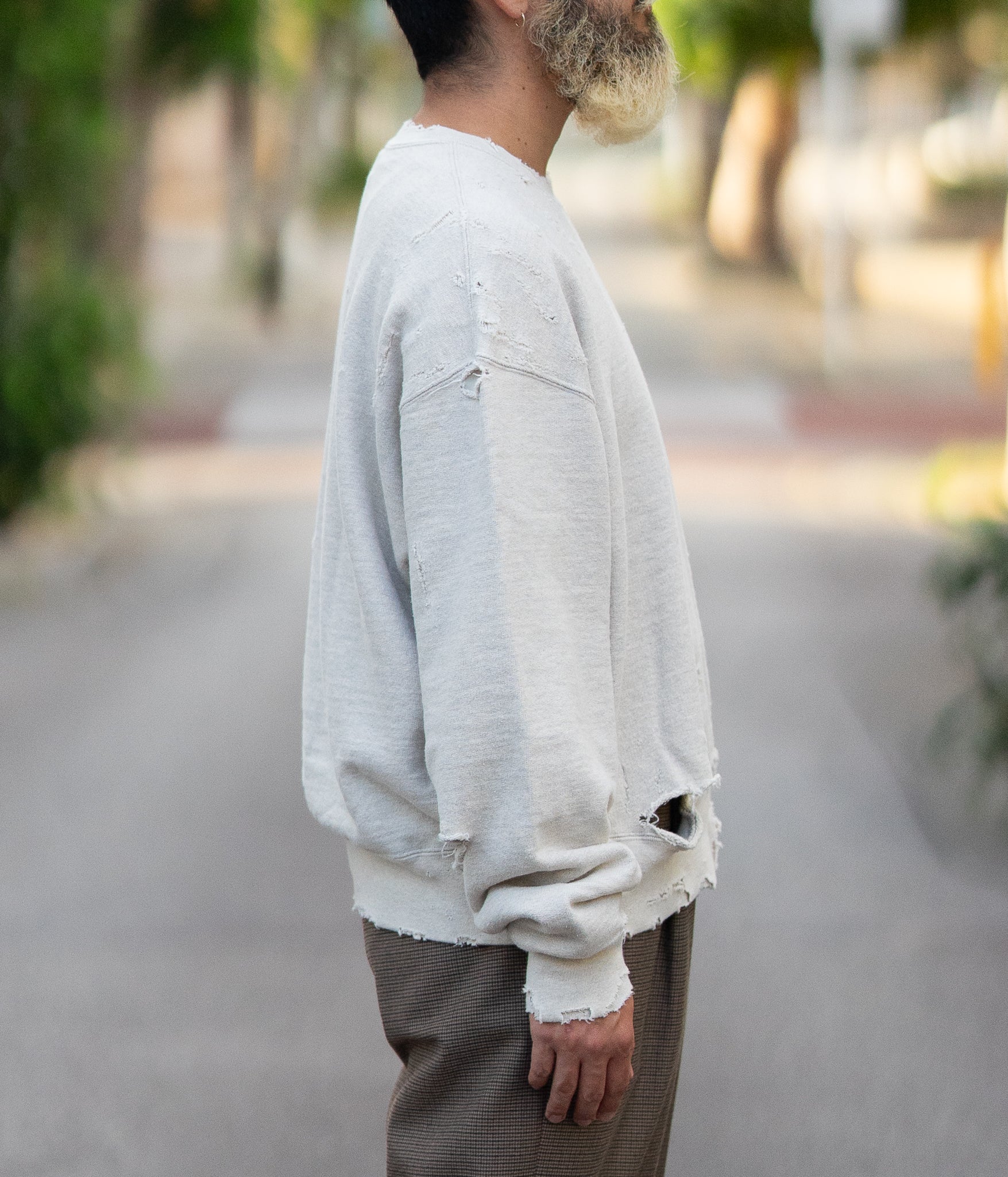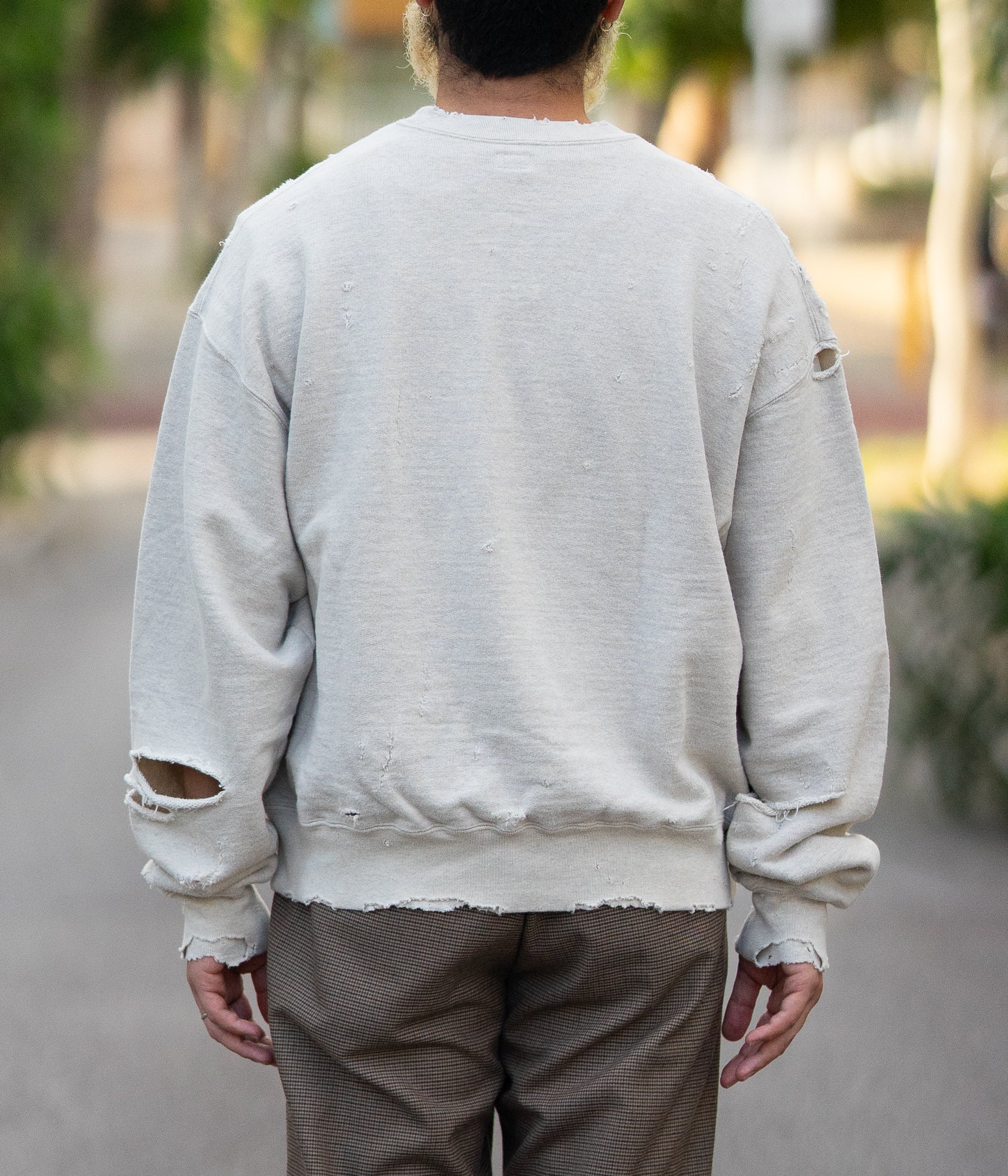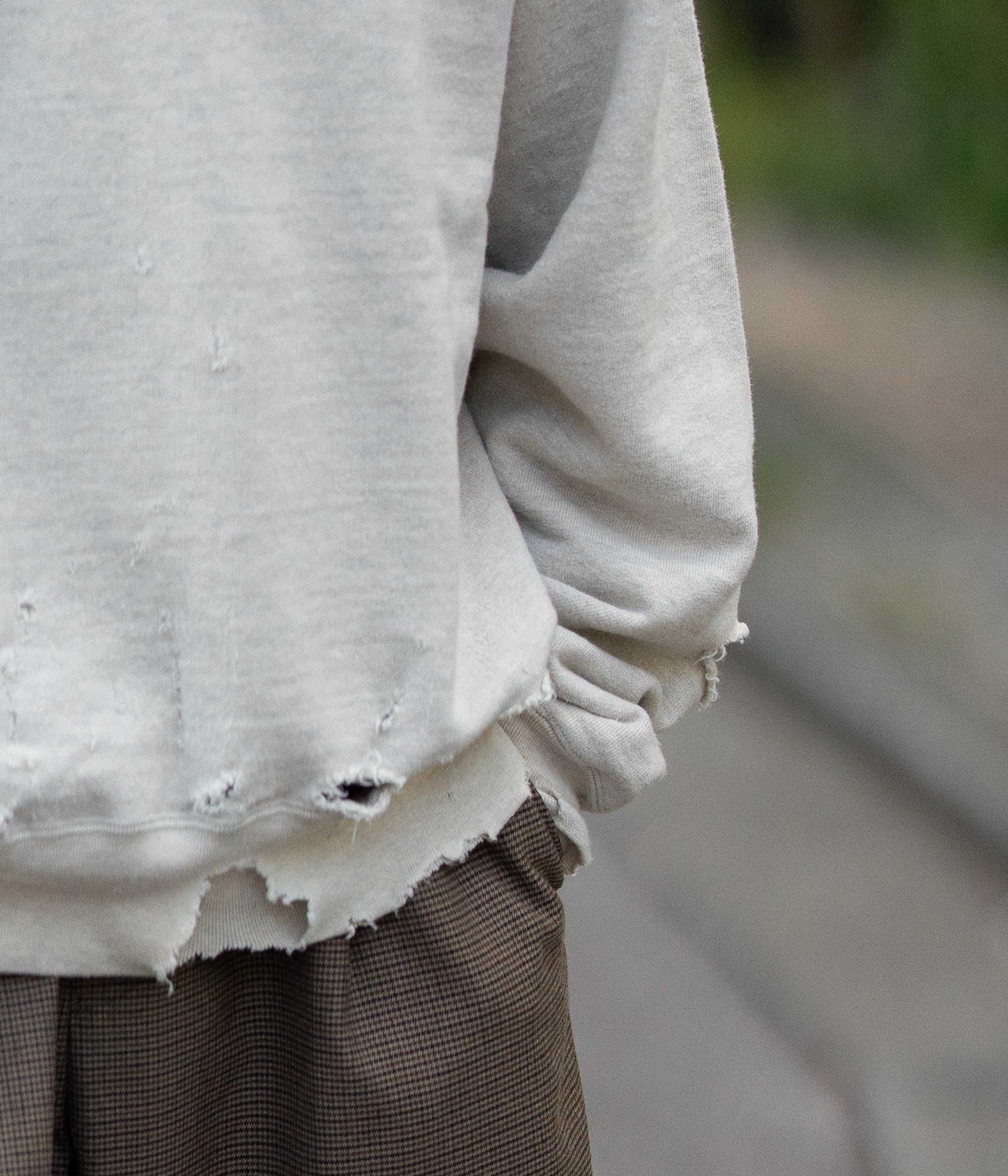 このダメージスウェットは、染め加工によって生まれる自然な風合いが特徴です。ダメージリペアが丁寧に施され、それぞれの部位に職人の手作業による修復が施され、一点ものの個性を際立たせています。製造には特殊な手法は一切使用されず、アナログな手法のみが用いられています。