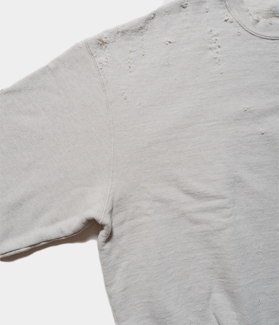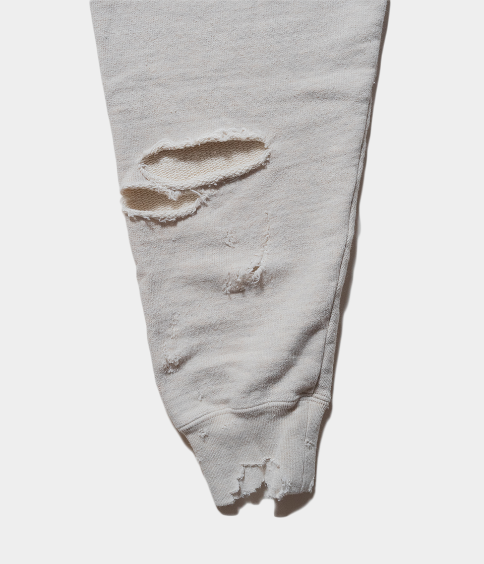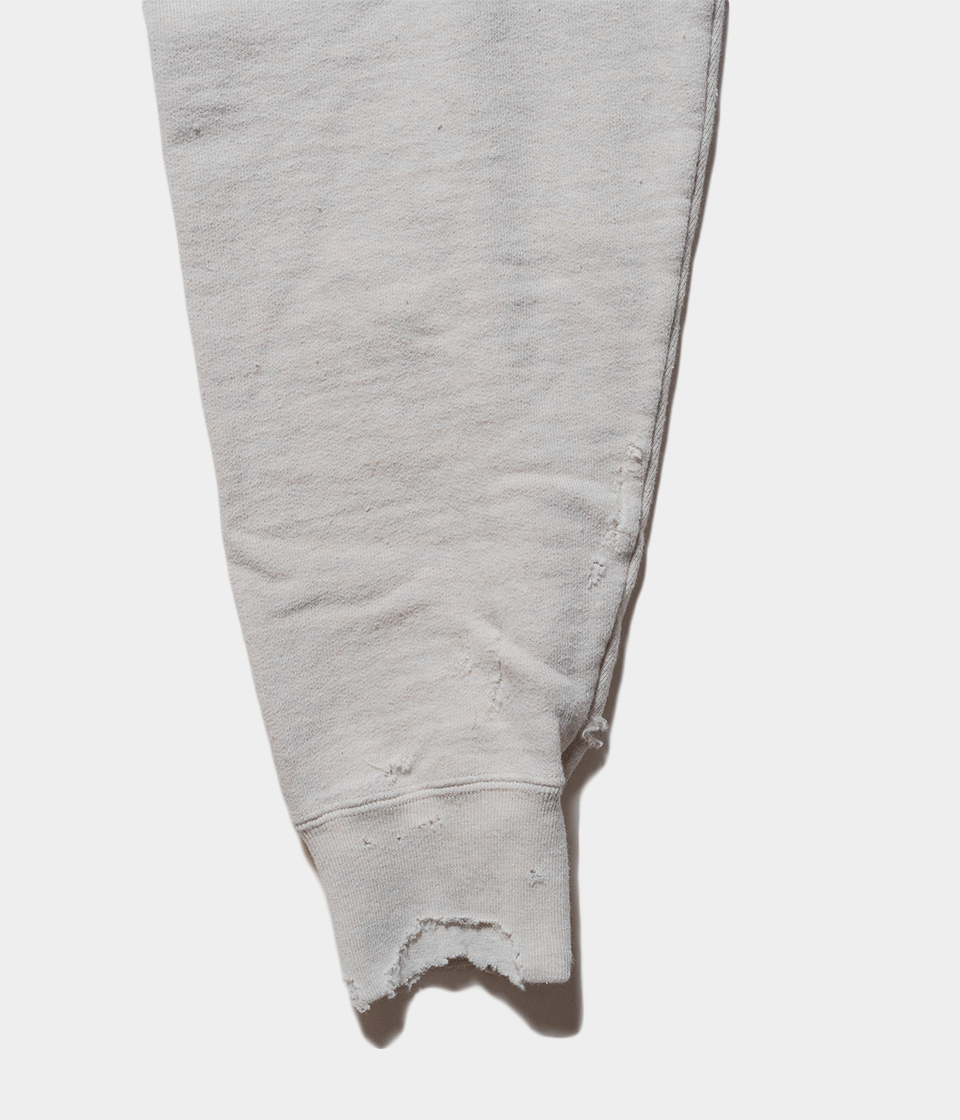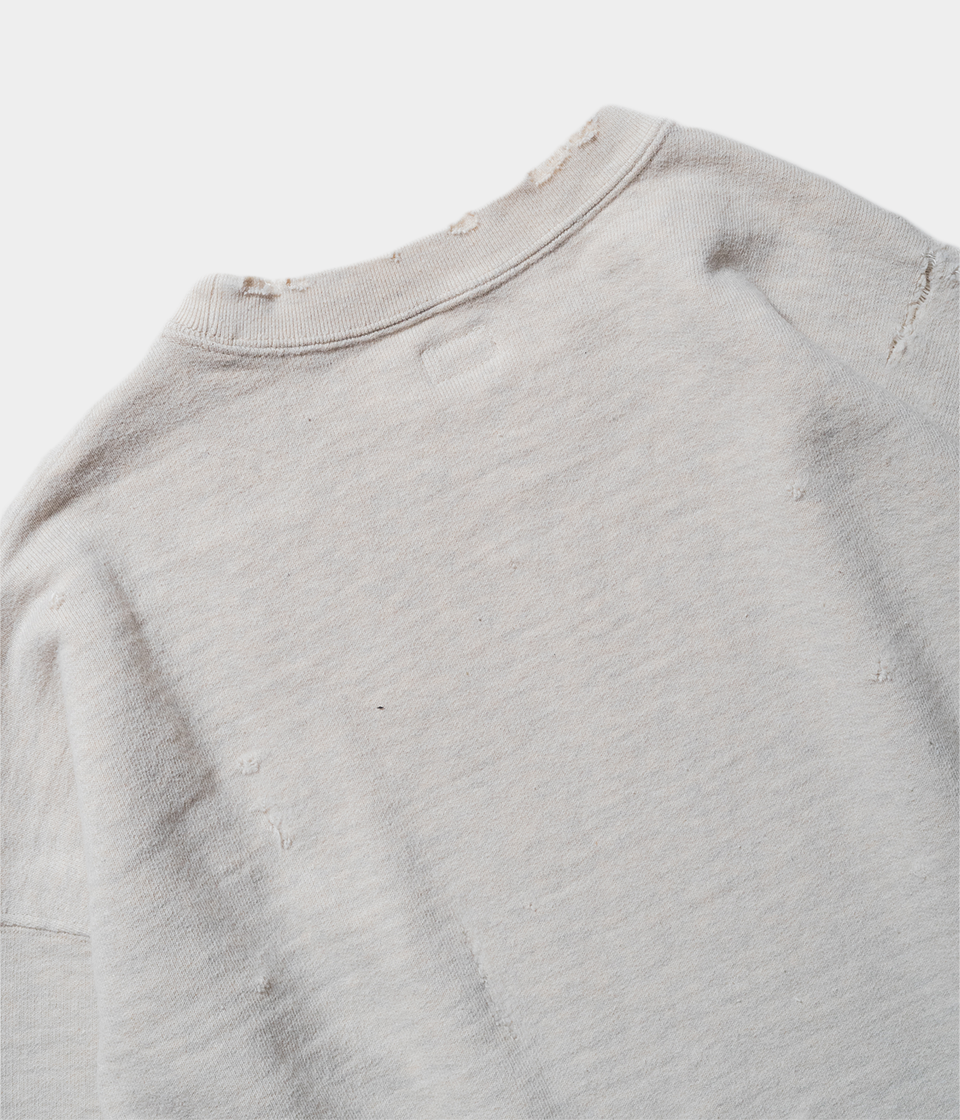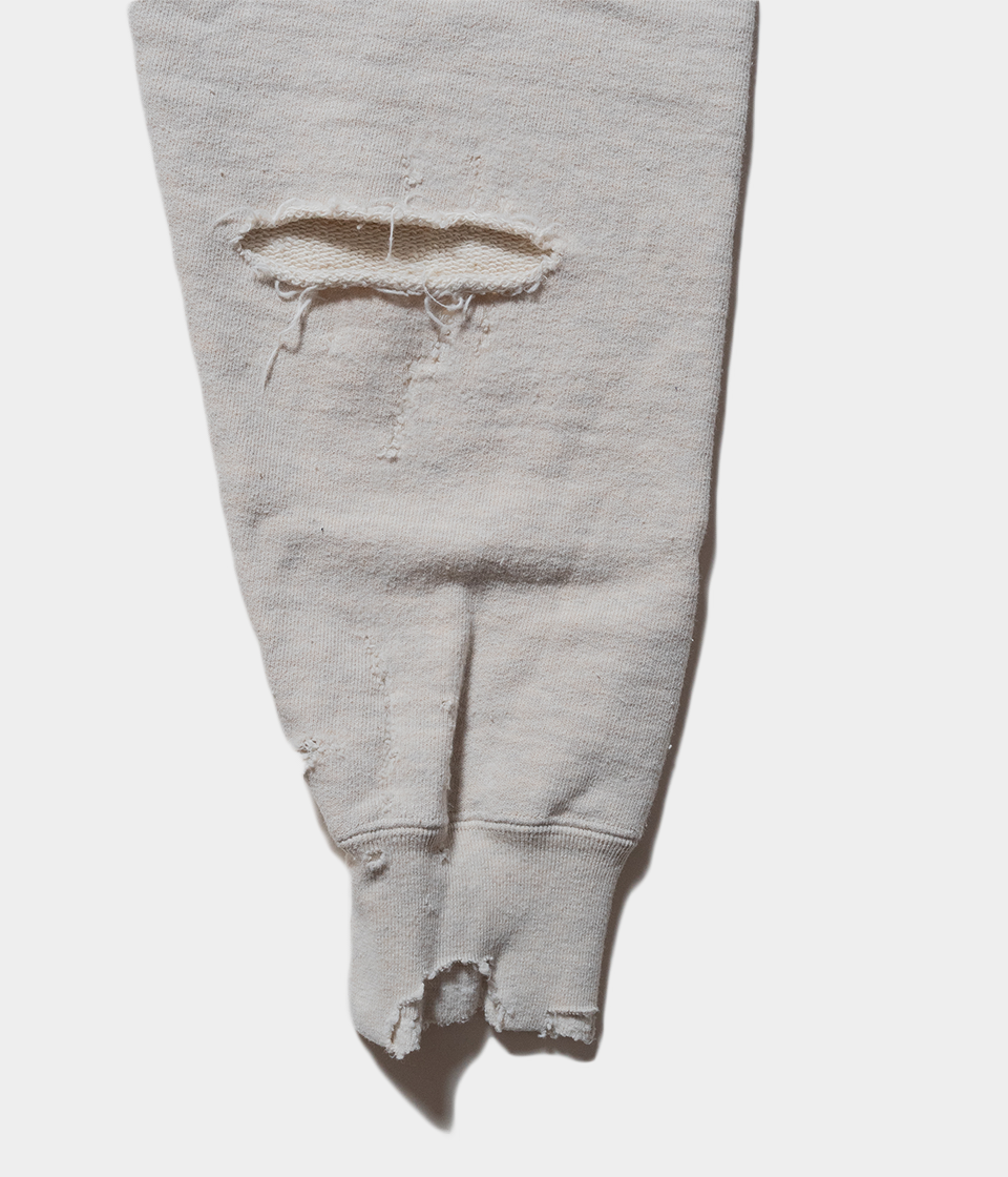 このダメージスウェットは、染め加工によって生まれる自然な風合いが特徴です。ダメージリペアが丁寧に施され、それぞれの部位に職人の手作業による修復が施され、一点ものの個性を際立たせています。製造には特殊な手法は一切使用されず、アナログな手法のみが用いられています。