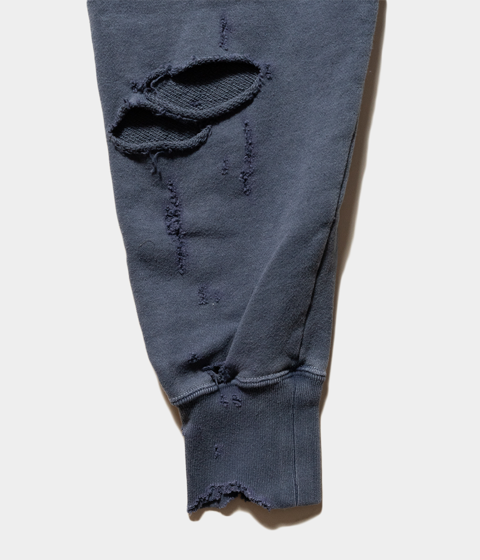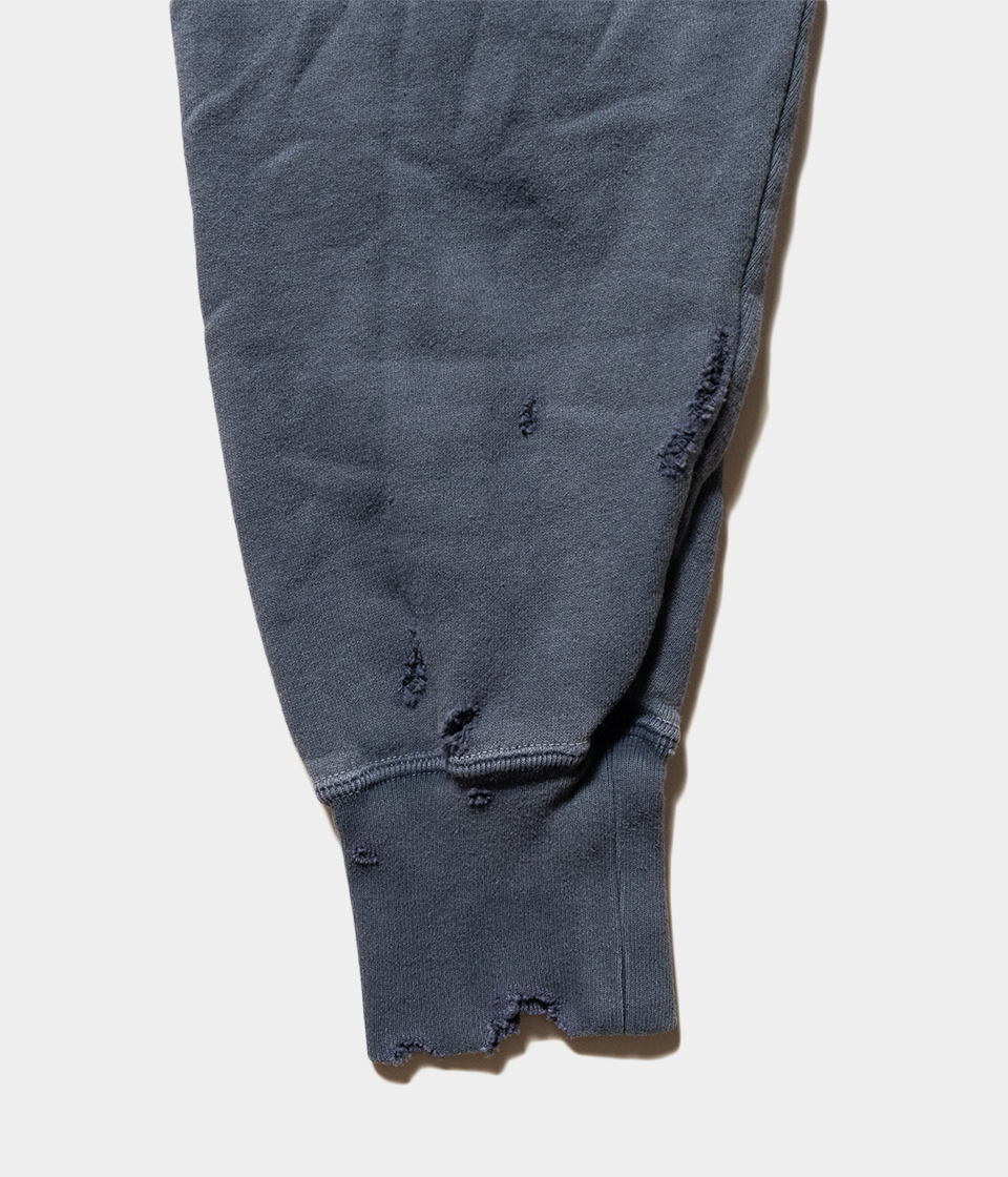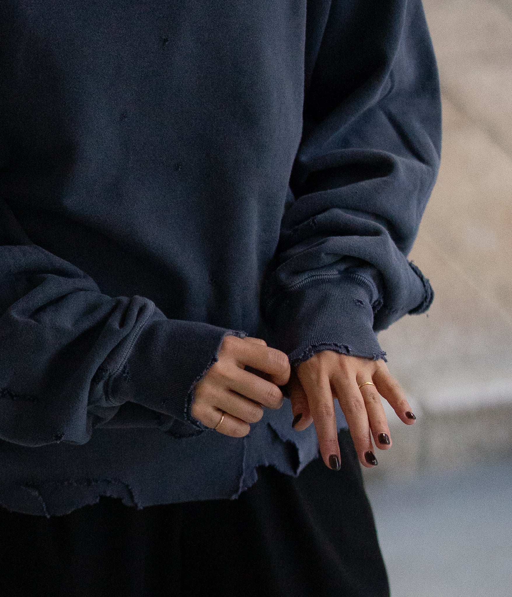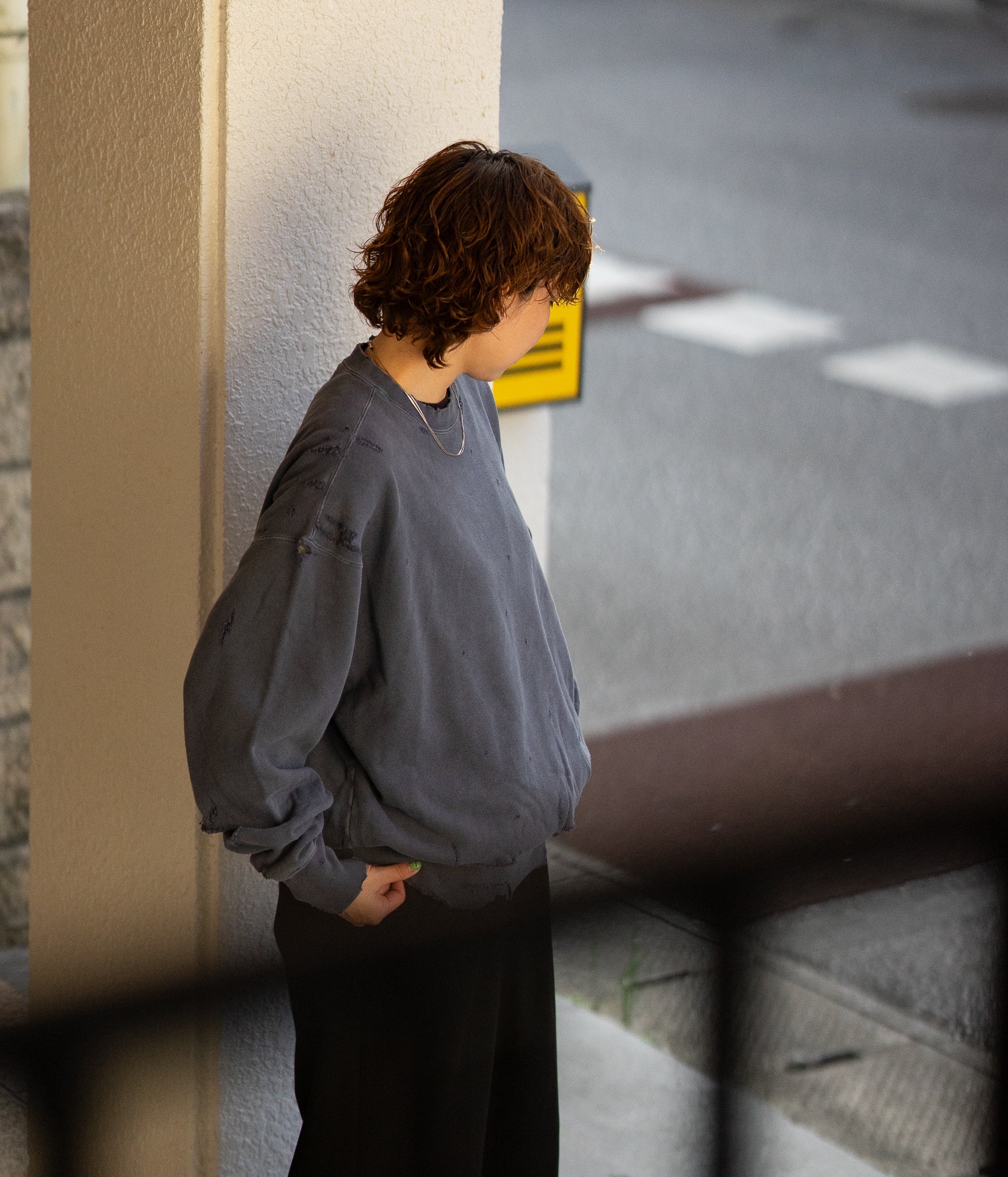 このダメージスウェットは、染め加工によって生まれる自然な風合いが特徴です。ダメージリペアが丁寧に施され、それぞれの部位に職人の手作業による修復が施され、一点ものの個性を際立たせています。製造には特殊な手法は一切使用されず、アナログな手法のみが用いられています。KUROのスペシャルアイテムは、少数精鋭のチームによって、アトリエでひっそりと作り上げられています。特別な手法や機械を一切使わず、手仕事にこだわりながら製品化されています。このアプローチによって、アイテムは独自性を保ち、着る者に特別な体験を提供します。製品は限られた数量で制作され、その希少性が高いものになります。